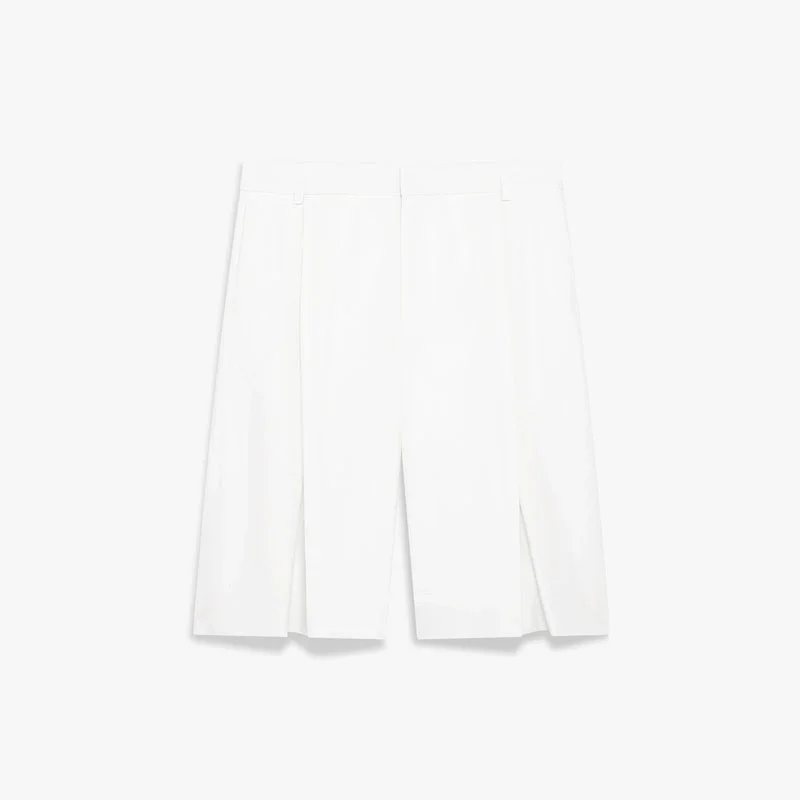 Los pantalones cortos holgados plisados blancos son un diseño refinado, a la altura de la rodilla y entallado, con detalles plisados en toda la prenda. Se completan con una cintura estructurada, presillas para cinturón, cierre de cremallera, bolsillos laterales inclinados, bolsillos traseros y una silueta relajada.