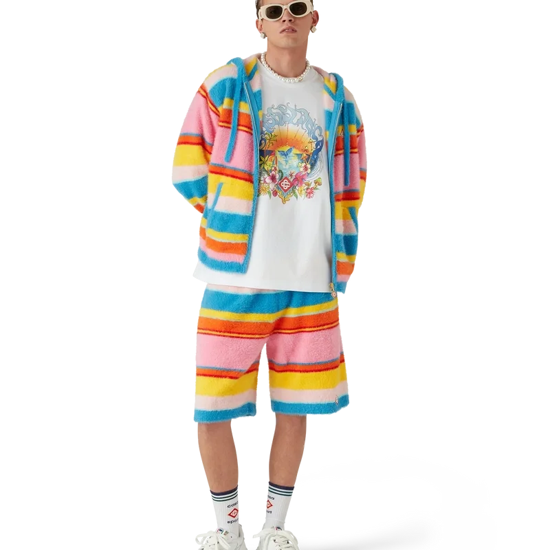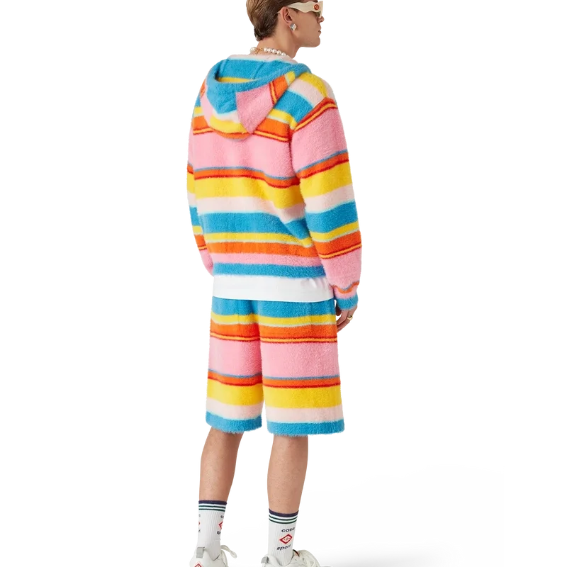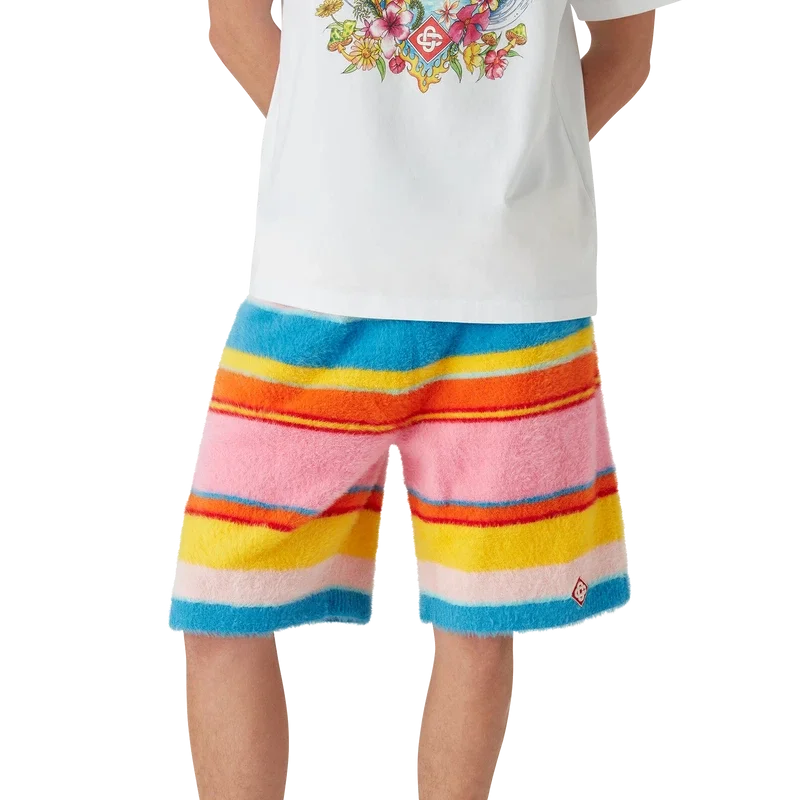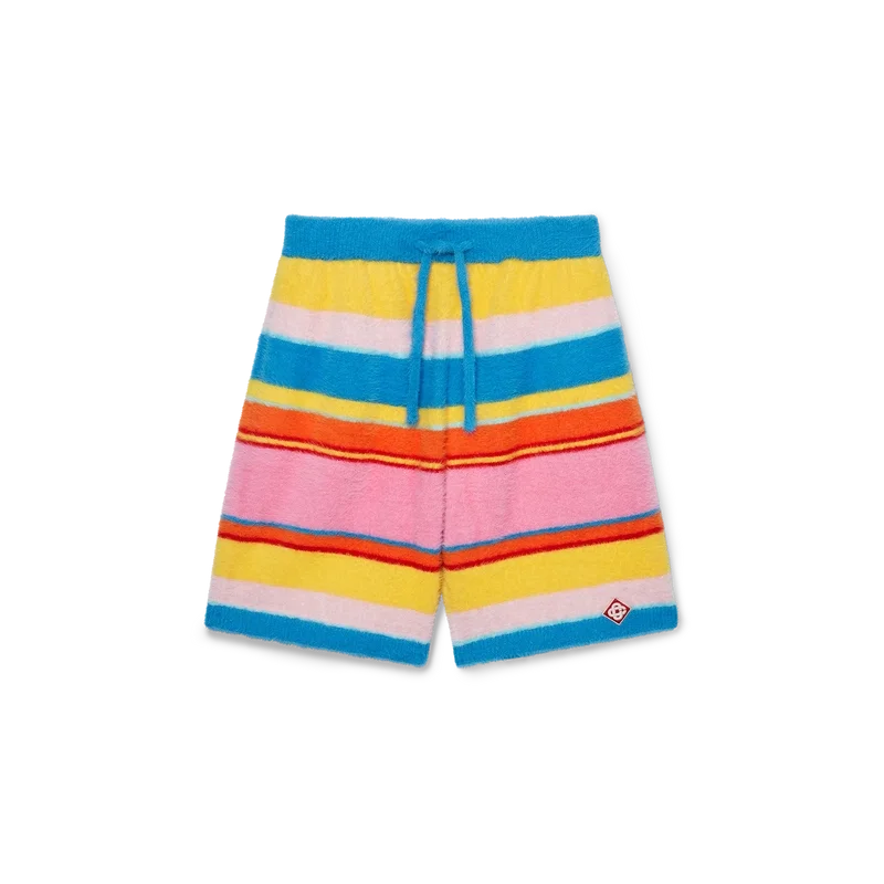 Los pantalones cortos oversize de rayas mullidas son un diseño a la altura de la rodilla confeccionado en tejido de punto mullido a rayas. Se completan con el logotipo de diamante característico de la casa, una cintura elástica, cierre con cordón, bolsillos delanteros inclinados y un bolsillo trasero de parche.