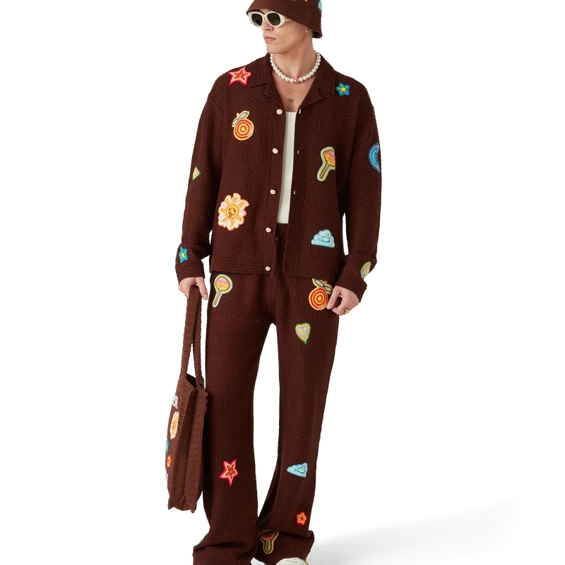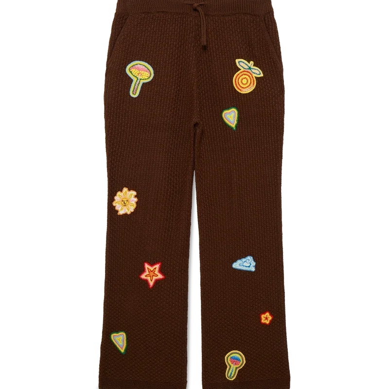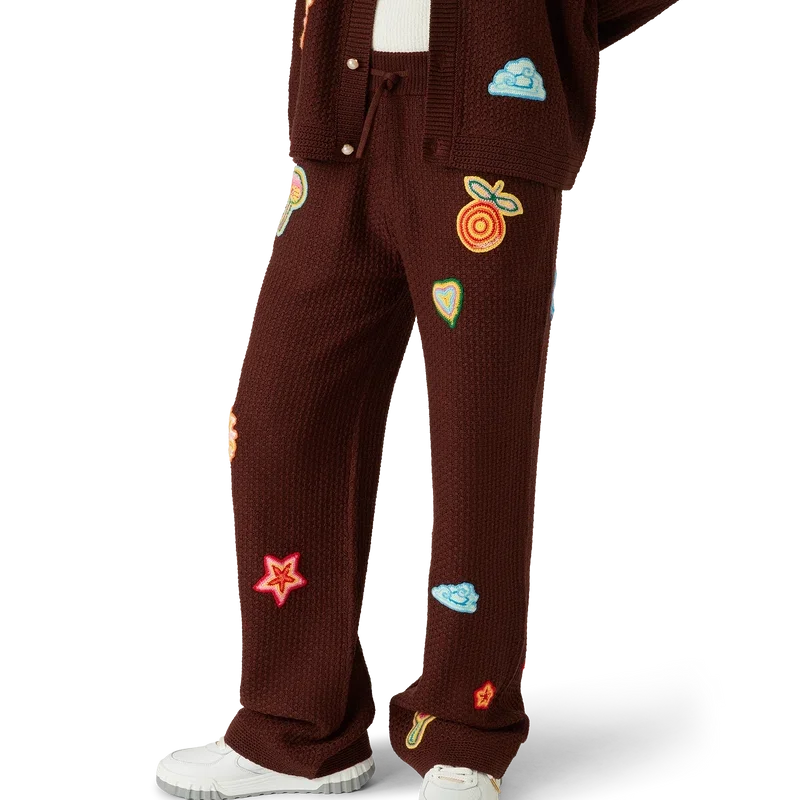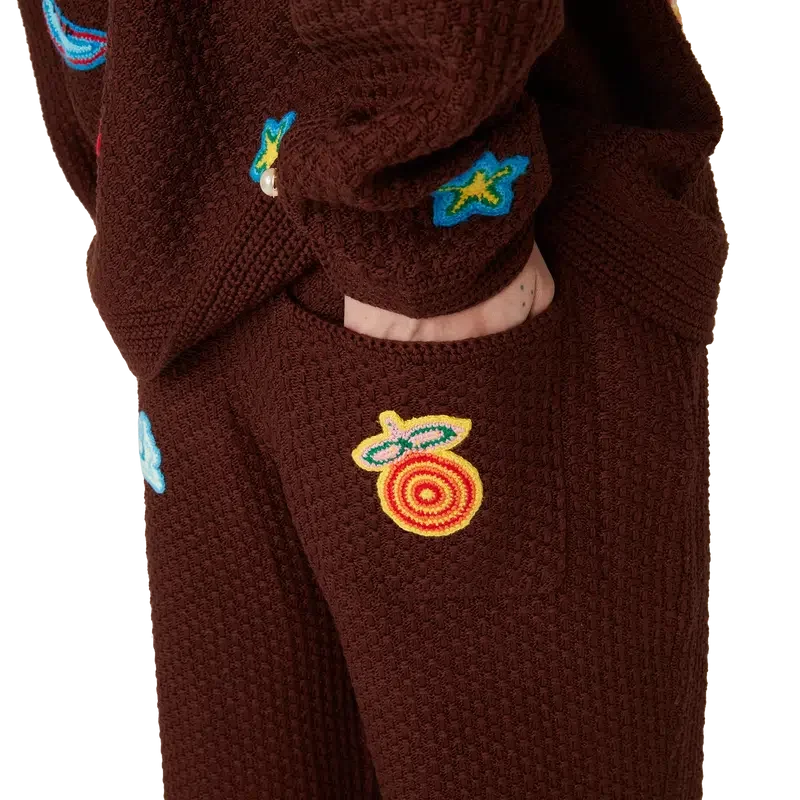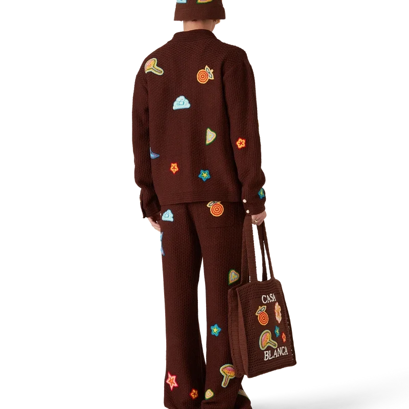 Los pantalones de ganchillo con motivos son un diseño de punto confeccionado con tejido de ganchillo de algodón mercerizado. Cuentan con una cintura elástica, cierre con cordón, bolsillos laterales en las costuras y motivos del elemento de diseño clásico de la casa.