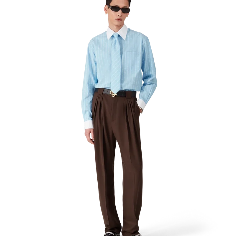 Los pantalones de lana con cinco pliegues tienen un diseño de pierna cónica confeccionado en lana virgen y cuentan con un forro de mezcla de algodón. Se completan con cierre de cremallera, cinco pliegues en la parte delantera, bolsillos delanteros inclinados, bolsillos traseros ribeteados con un pequeño pliegue y presillas anchas para el cinturón.