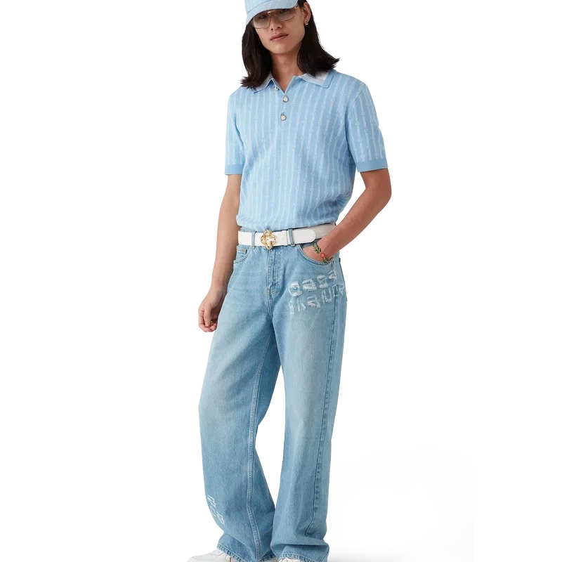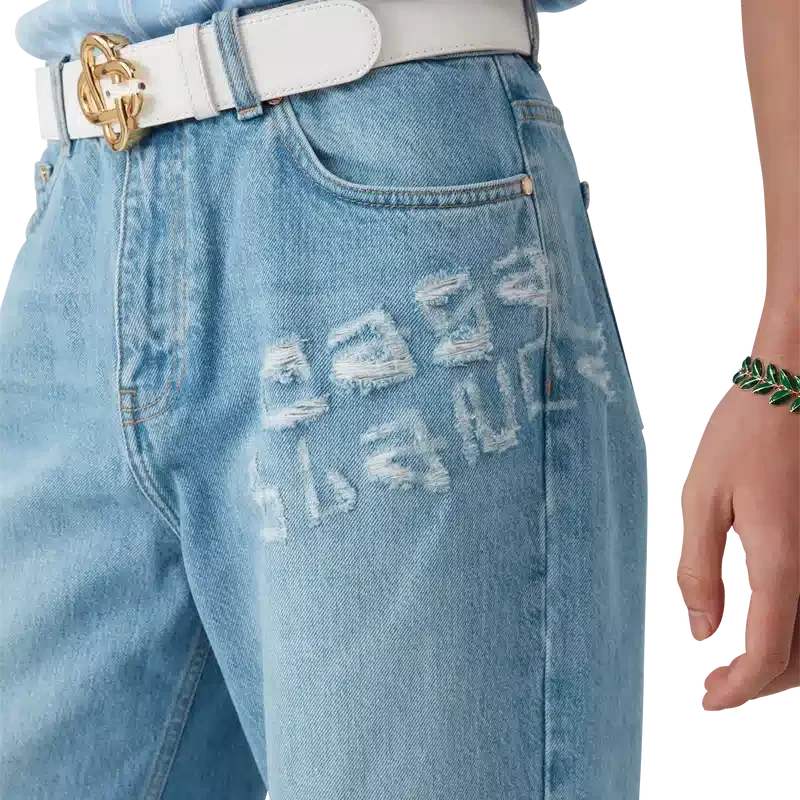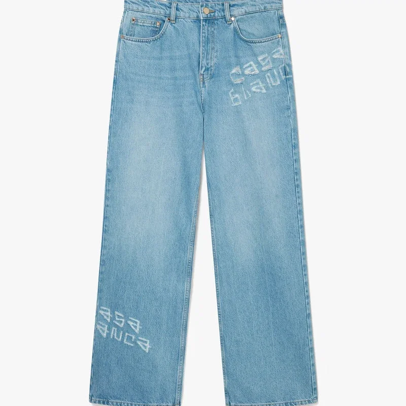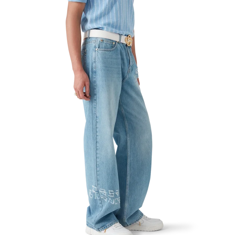 Los jeans de mezclilla desgastada con estilo graffiti tienen un diseño de pierna recta confeccionado en tela de algodón y presentan el logotipo apilado característico en un texto estilo graffiti grabado en la tela. Se completan con herrajes chapados en oro, presillas para el cinturón, bolsillos delanteros y traseros, un parche de cuero con la marca y cierre de cremallera.