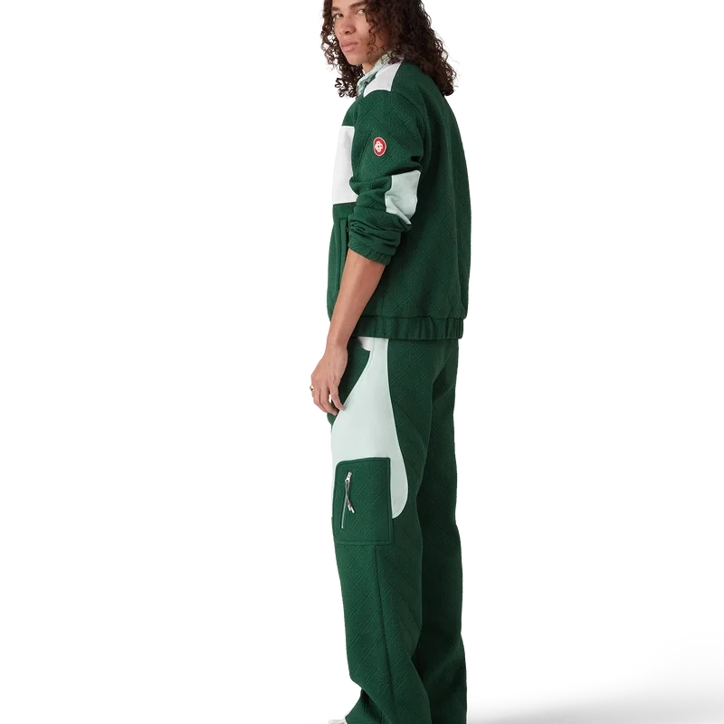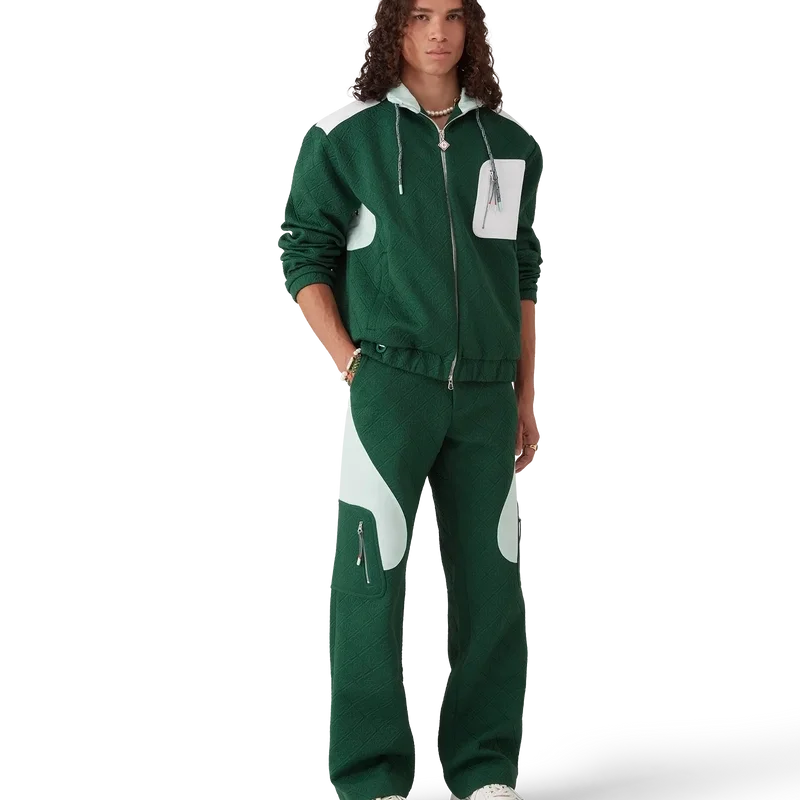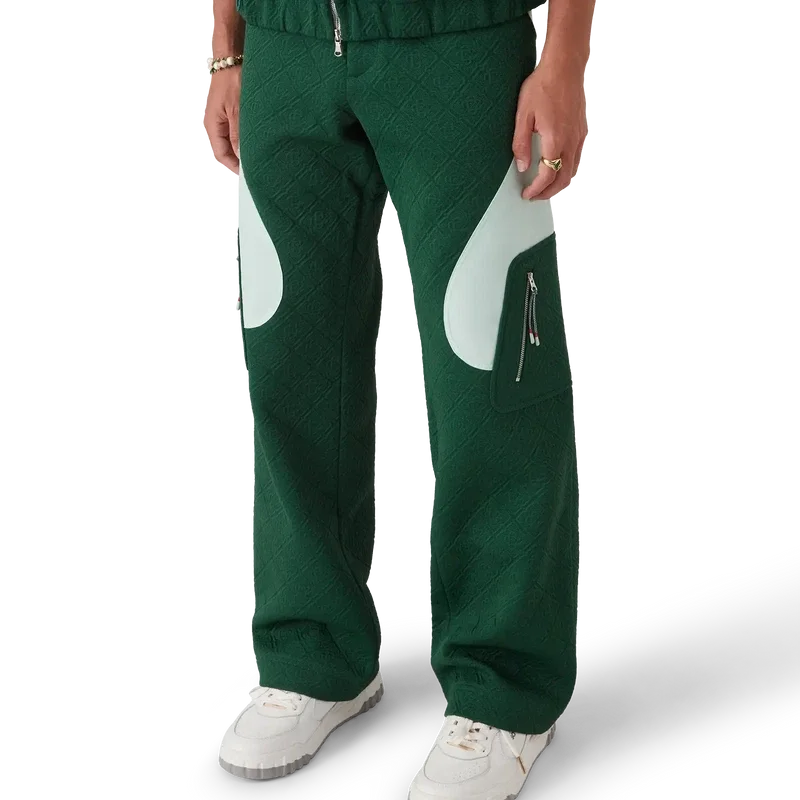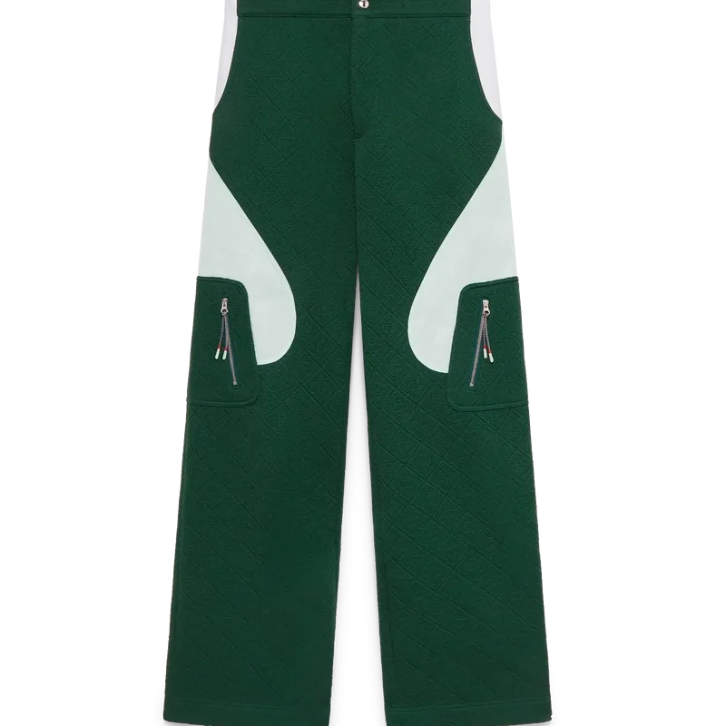 Los pantalones de punto jacquard Monogram tienen un diseño de pierna recta con paneles de bloques de color en contraste. Se completan con una cintura con un botón a presión chapado en oro con el logotipo de la marca, cierre de cremallera, paneles laterales en contraste, bolsillos delanteros inclinados y bolsillos de parche laterales con cierres de cremallera verticales y tiradores inspirados en cuerdas de montañismo.