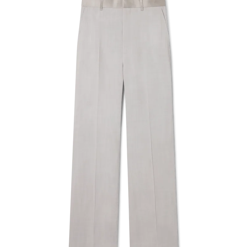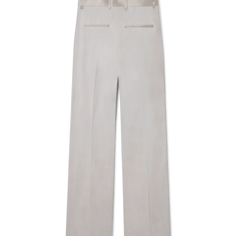 Los pantalones entallados de corte relajado están confeccionados con tejido de sastrería y cuentan con un forro de mezcla de algodón. Se completan con trabillas, cierre de cremallera, bolsillos laterales inclinados y un bolsillo trasero de ribete, diseñados para un ajuste relajado.