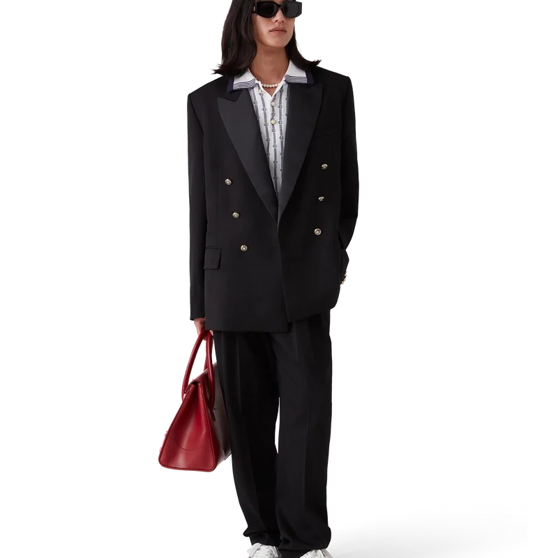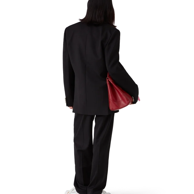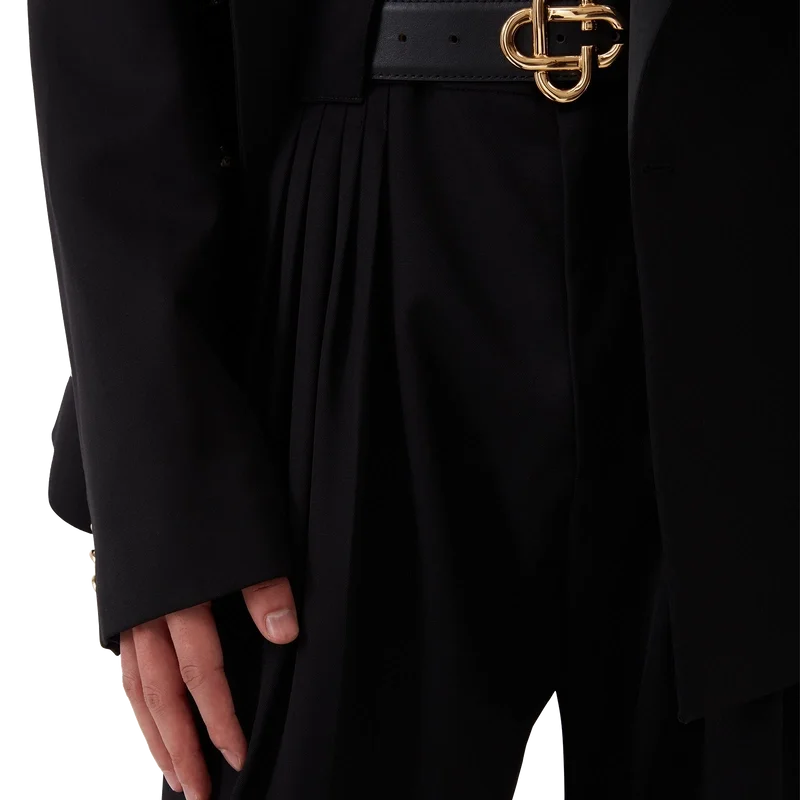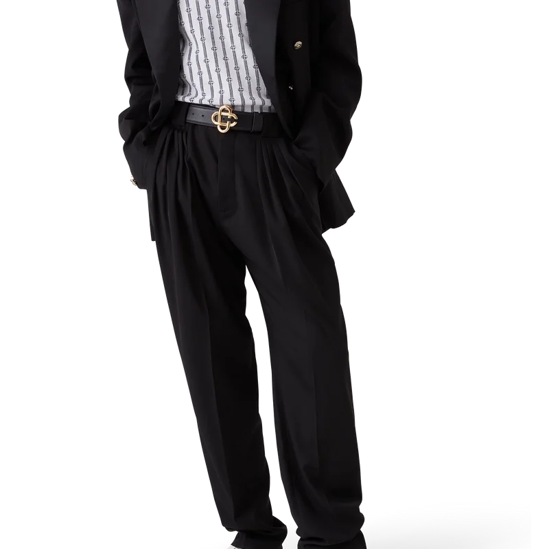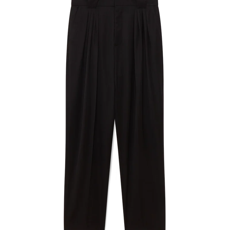 Los pantalones entallados de lana con cinco pliegues tienen un diseño de pierna cónica confeccionado en lana virgen y cuentan con un forro de mezcla de algodón. Se completan con cierre de cremallera, cinco pliegues en la parte delantera, bolsillos delanteros en diagonal, bolsillos traseros de ribete con un pequeño pliegue de caja y presillas anchas para el cinturón.