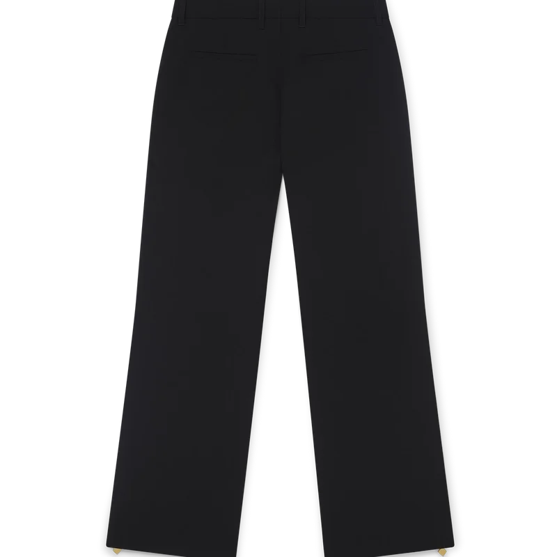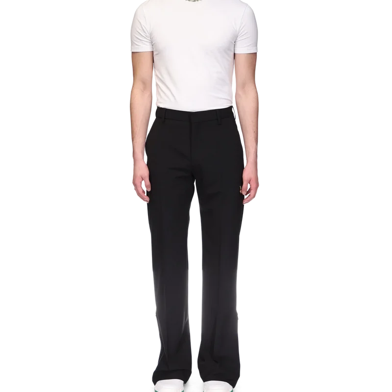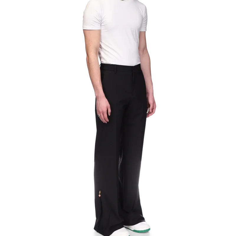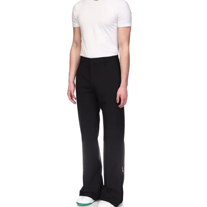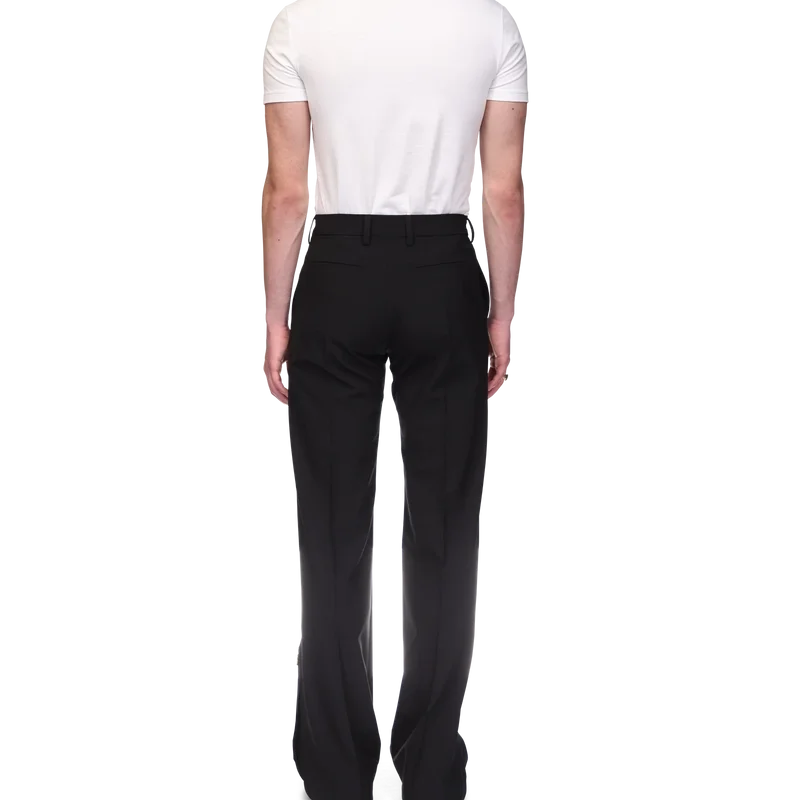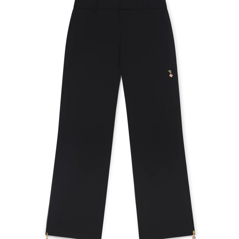 Los pantalones de sastrería deportiva presentan un diseño ajustado inspirado en la ropa deportiva, confeccionados en un tejido de mezcla de lana. Cuentan con cierre de cremallera, aberturas laterales con inserciones de malla, bolsillos laterales inclinados, bolsillos traseros con ribete, un bolsillo con cremallera en el muslo con tirador con el diamante de la marca y presillas para el cinturón.