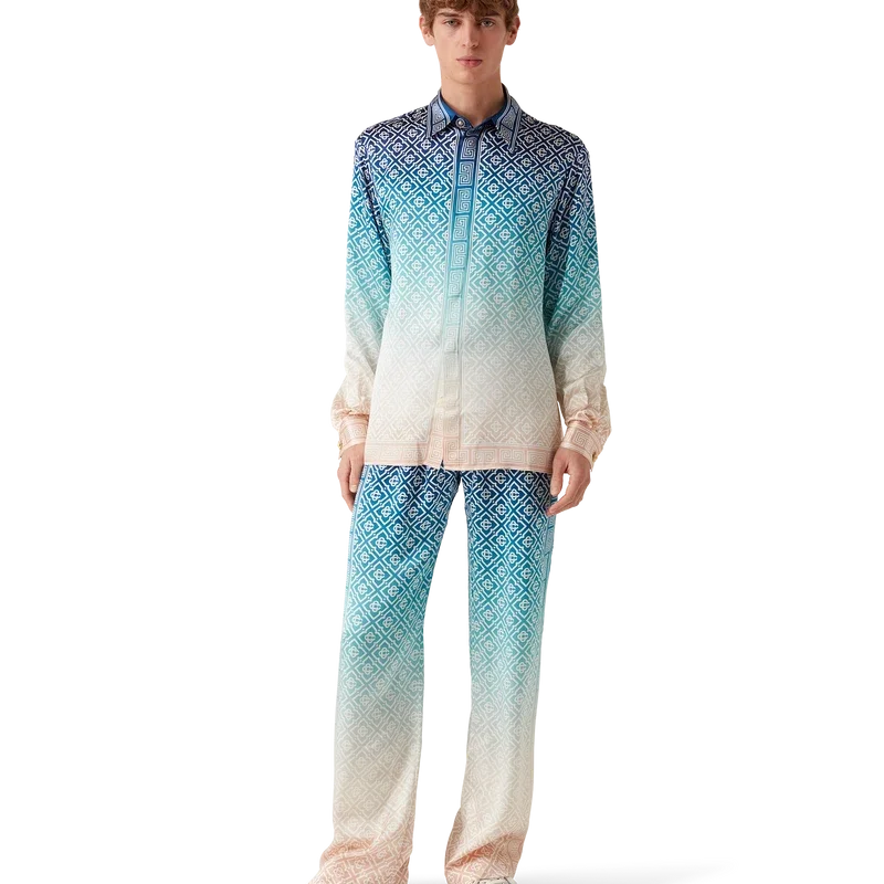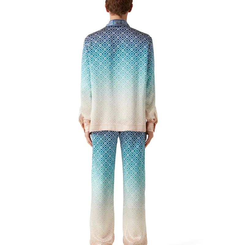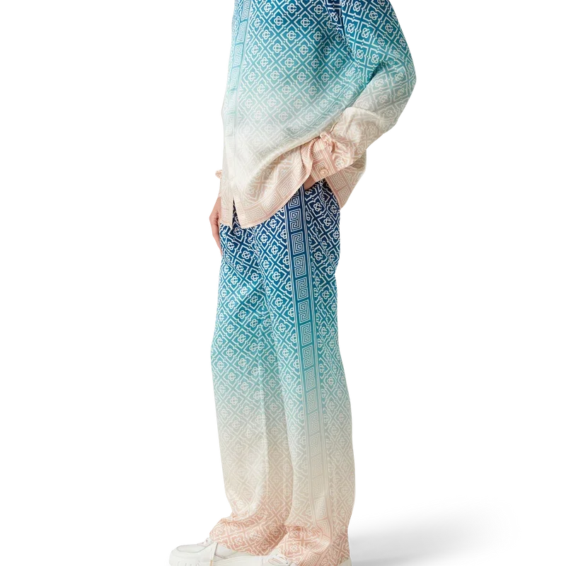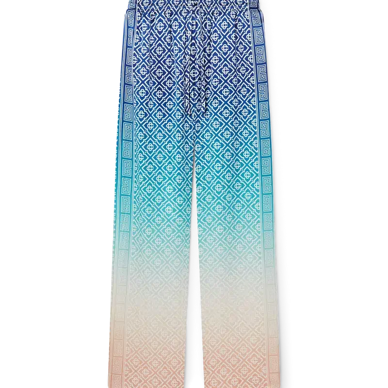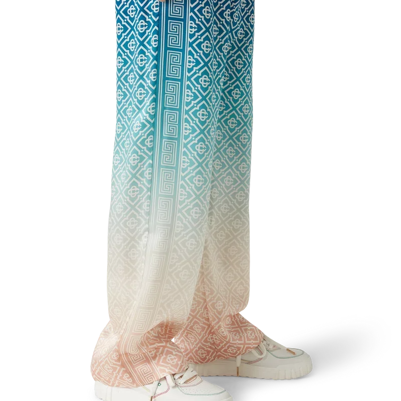 Los pantalones de seda con degradado jacquard presentan un estampado integral con el monograma característico de la casa, confeccionados en tejido de satén de seda. Cuentan con cintura elástica, bolsillos en las costuras y forro.