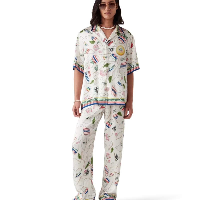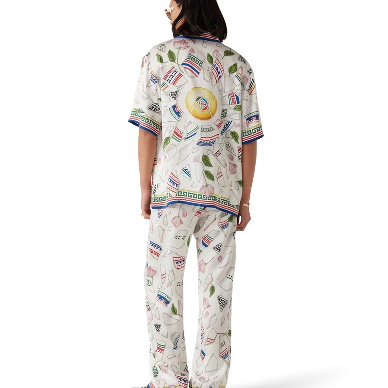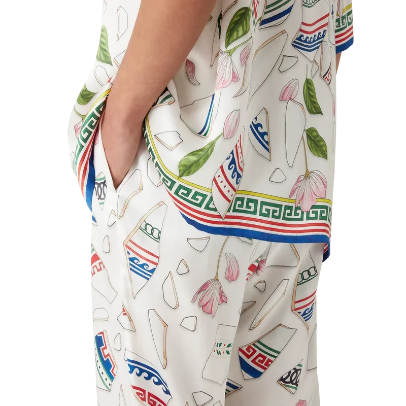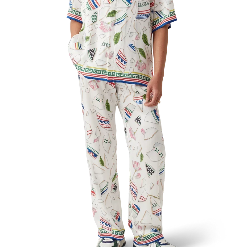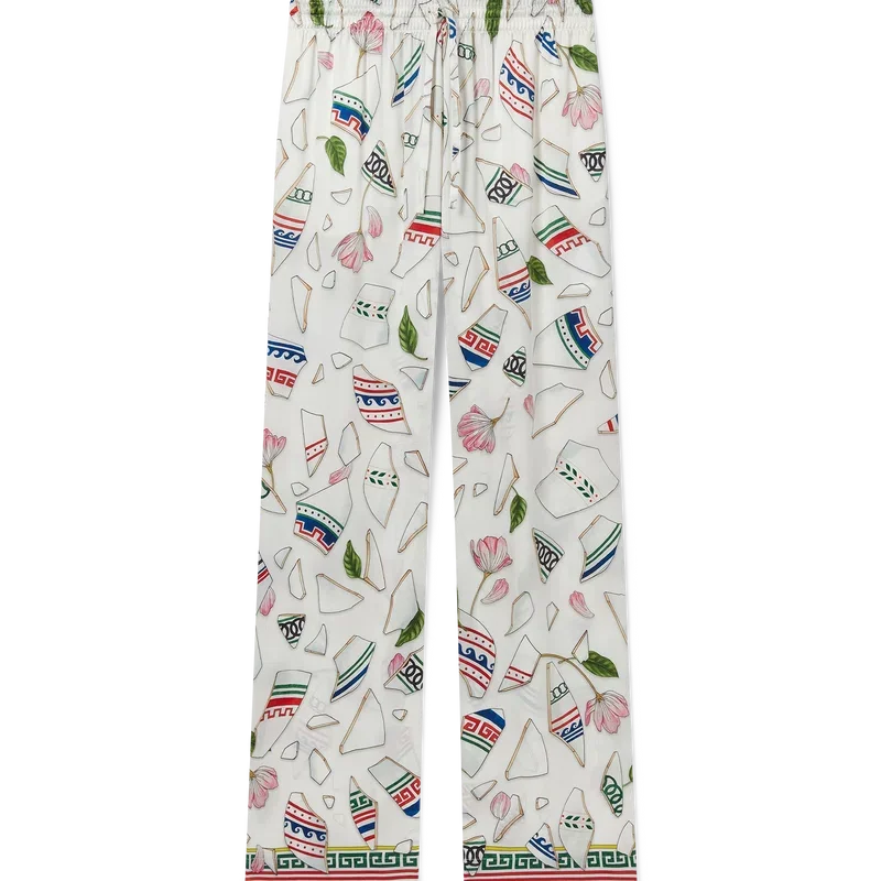 Los pantalones de seda Le Vase Brise presentan un diseño estampado integral confeccionado en tejido de satén de seda con el estampado de temporada de la casa, inspirado en el estudio continuo de la belleza clásica y el encanto contemporáneo de la Antigua Grecia. Se completan con una cintura elástica, bolsillos laterales en las costuras, un bolsillo de parche trasero, cierre con cordón y detalles inspirados en la clave griega en el dobladillo.