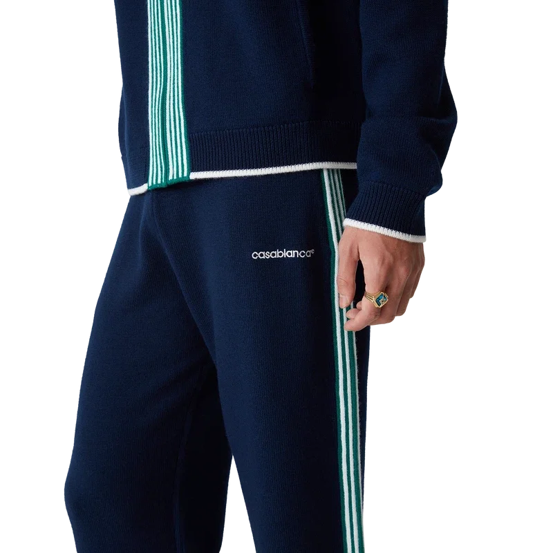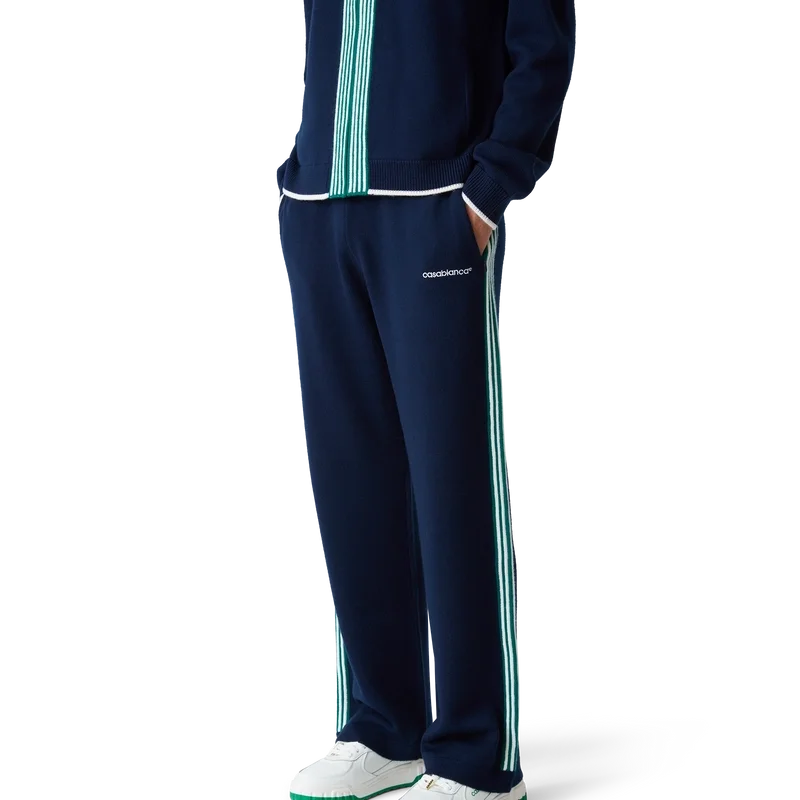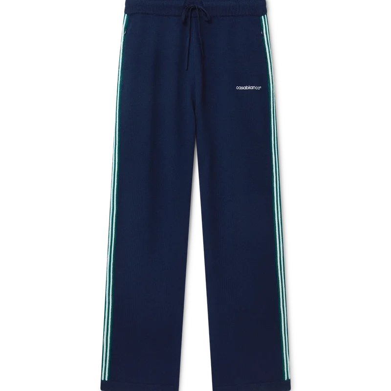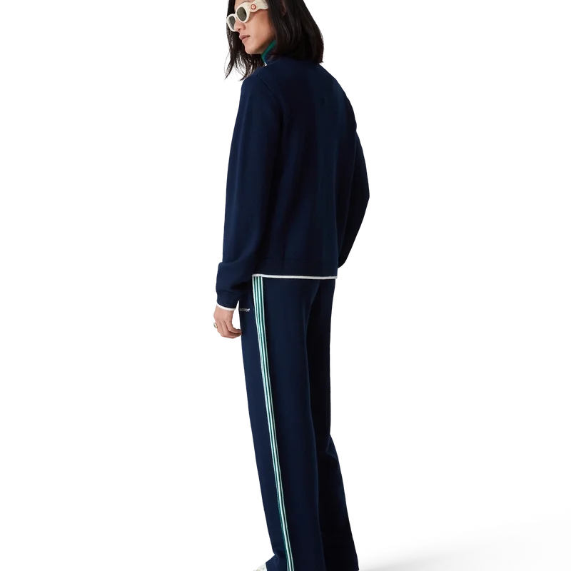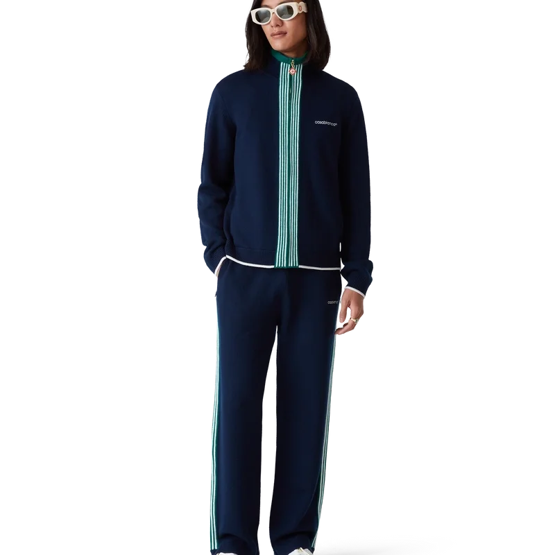 Los pantalones de tenis de punto tienen un diseño inspirado en la ropa deportiva confeccionado en tejido de lana merino. Se completan con detalles de ribete en contraste en los puños, el dobladillo, el cuello y la tapeta, cierre frontal con cremallera, cuello de embudo y logotipo de Casablanca.