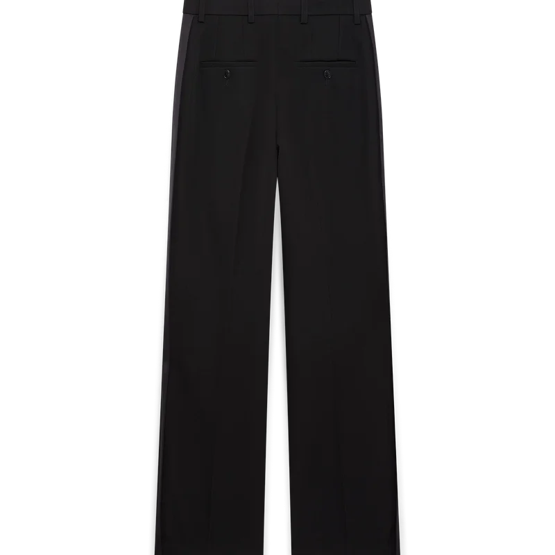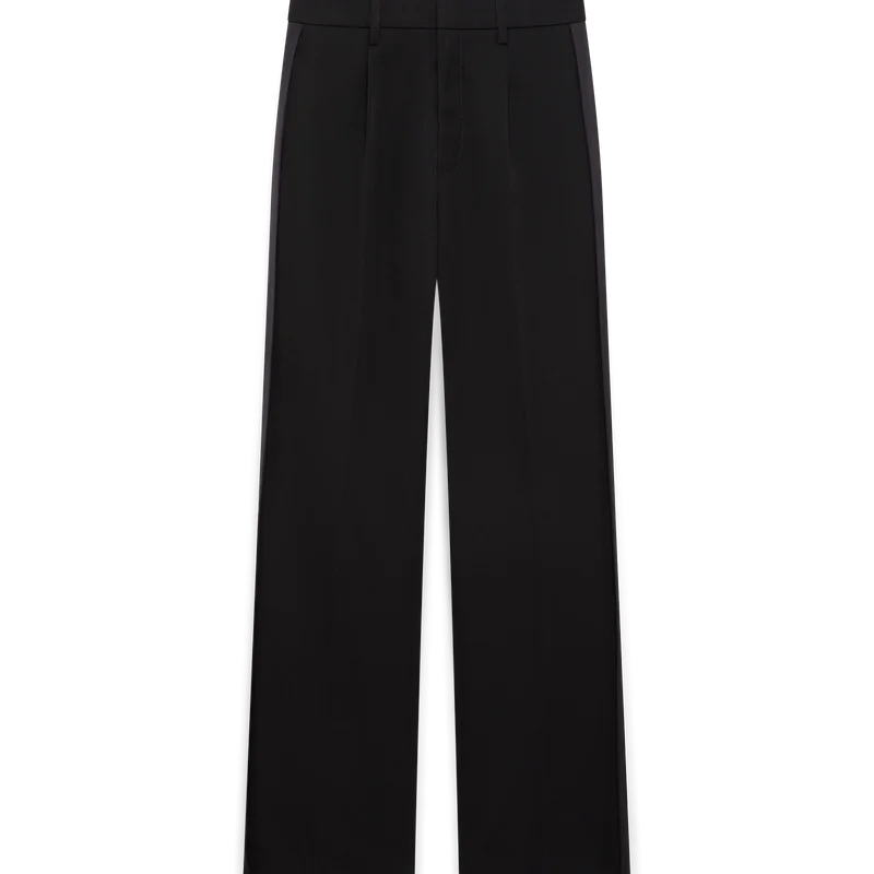 Los pantalones plisados de sastrería de lana tienen un diseño de pierna recta confeccionado con tejido de sastrería. Cuentan con pliegues delanteros, cierre de cremallera, bolsillos delanteros inclinados, forro, presillas para cinturón, bolsillos traseros de ribete y paneles de viscosa a los lados.