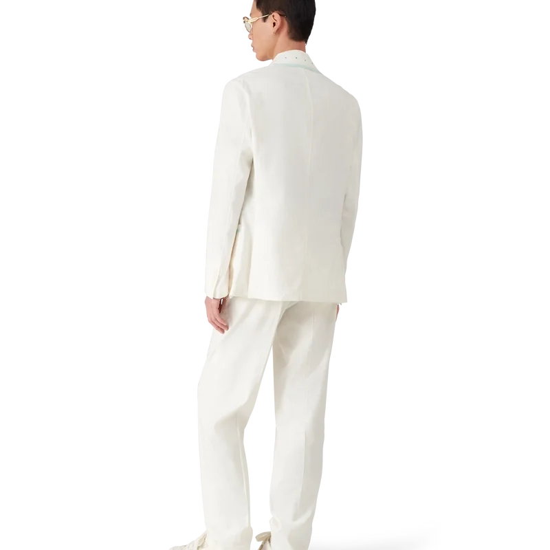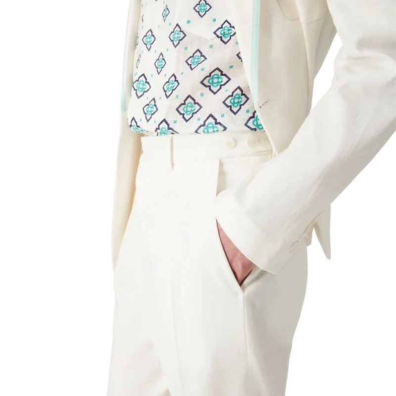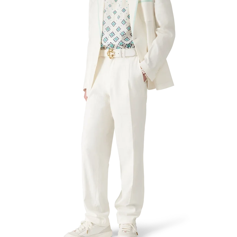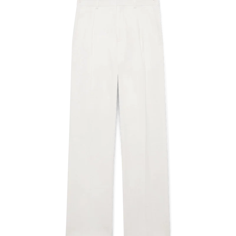 Los pantalones plisados de lino tienen un diseño cónico confeccionado en tejido de lino. Cuentan con cierre de cremallera, bolsillos delanteros en diagonal, bolsillo trasero ribeteado, presillas para cinturón y pliegues.