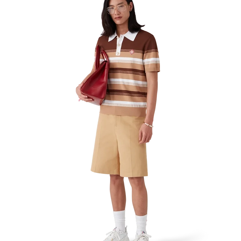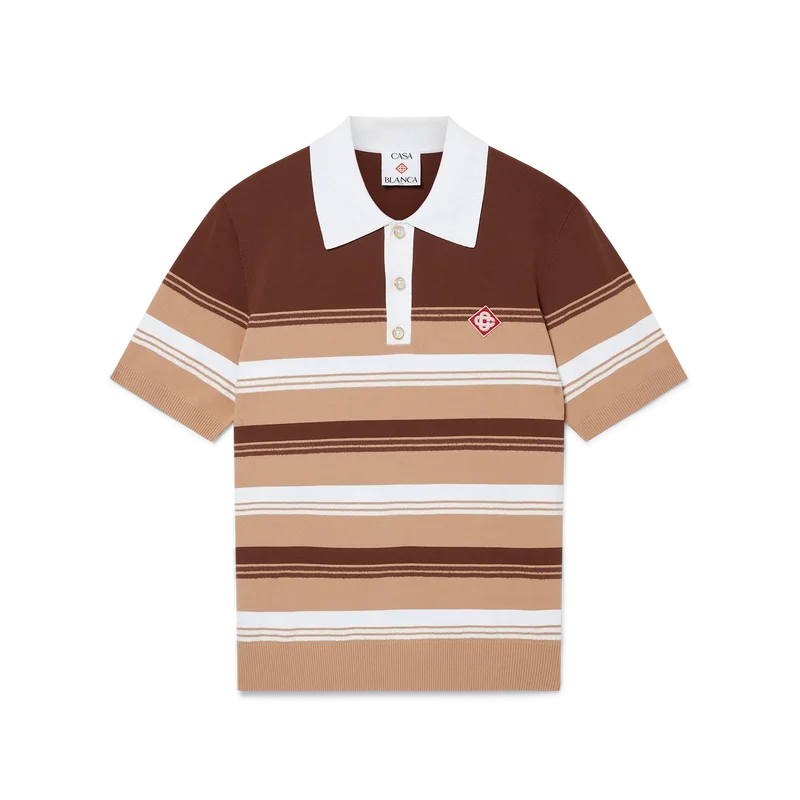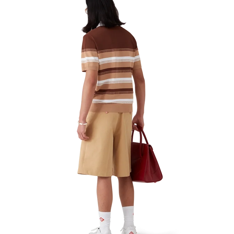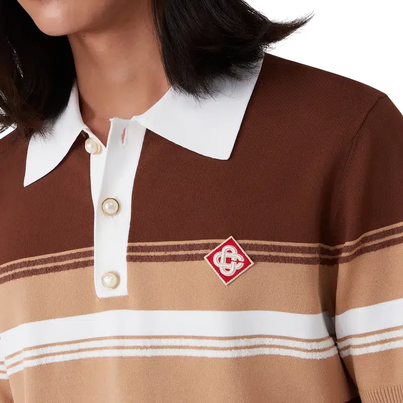 El polo a rayas es un diseño de manga corta confeccionado en tejido de punto a rayas con el emblemático logotipo de diamante de la casa. Se completa con botones de perla con borde dorado característicos, tapeta de tres botones y puños, dobladillo, cuello y tapeta acanalados.