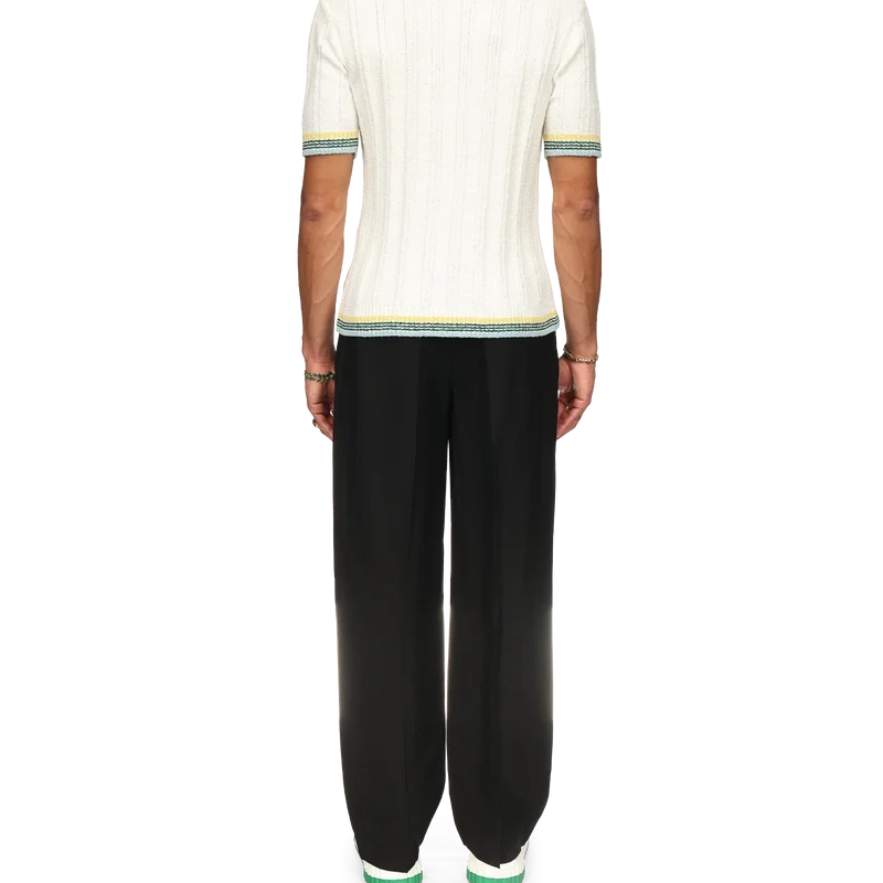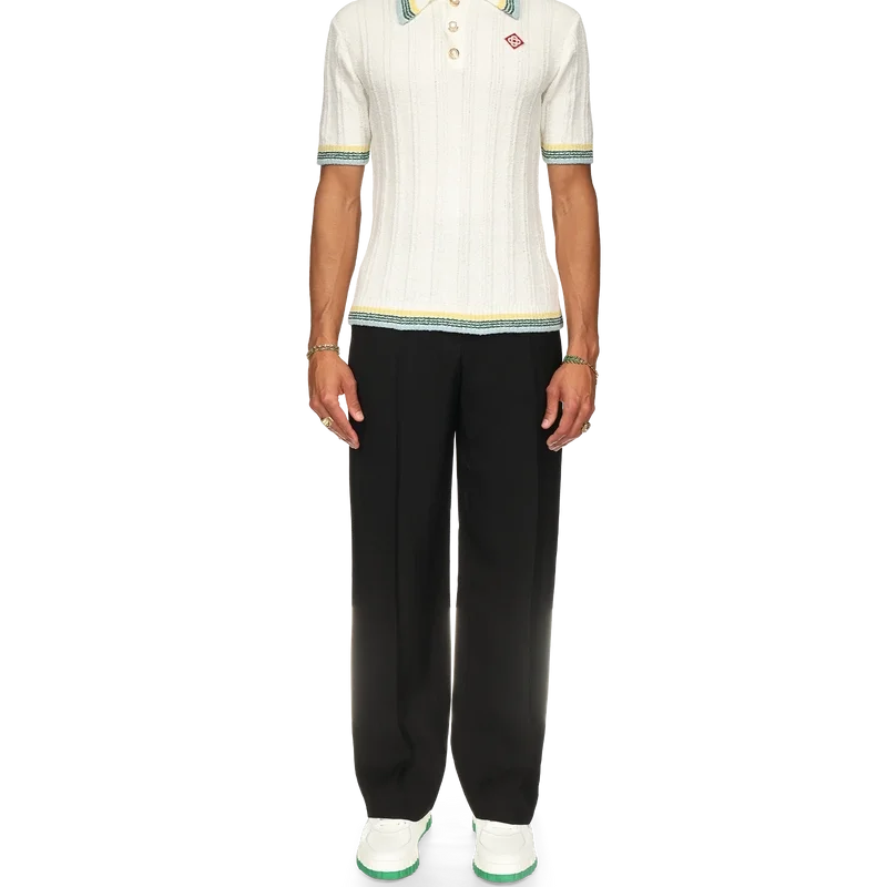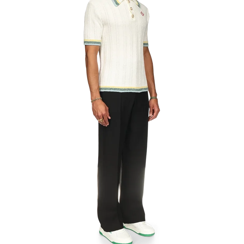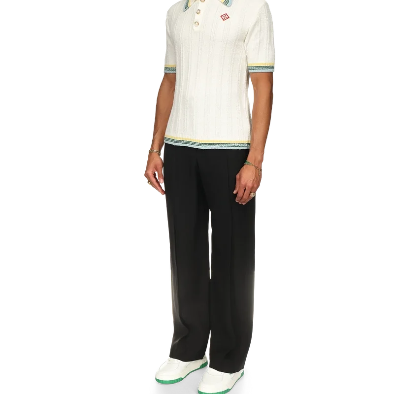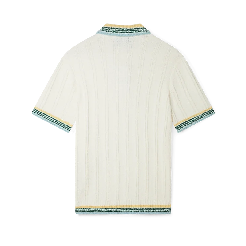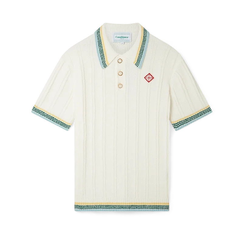 La camisa de bouclé acanalada presenta un logotipo de diamante rojo y una textura acanalada. Confeccionada en tejido de mezcla de algodón y rematada con botones de perla con borde dorado, una etiqueta con la marca Casablanca y detalles de rayas en el cuello, los puños y el dobladillo.