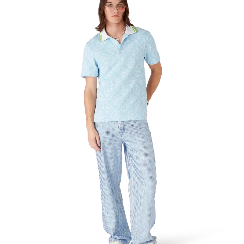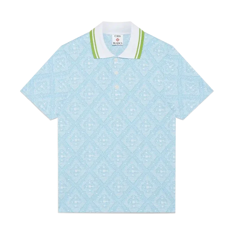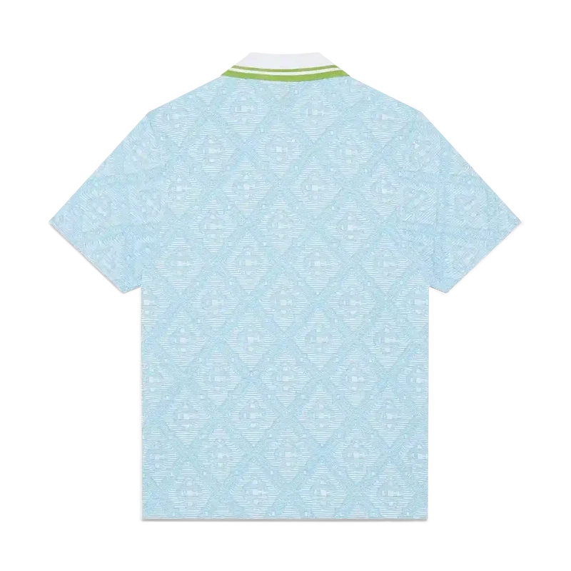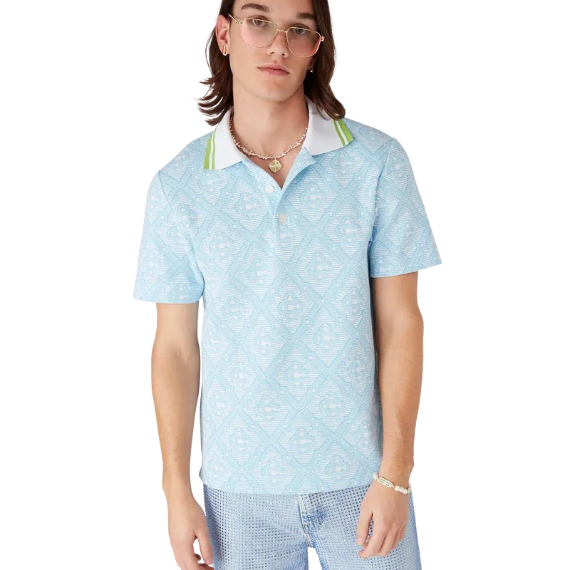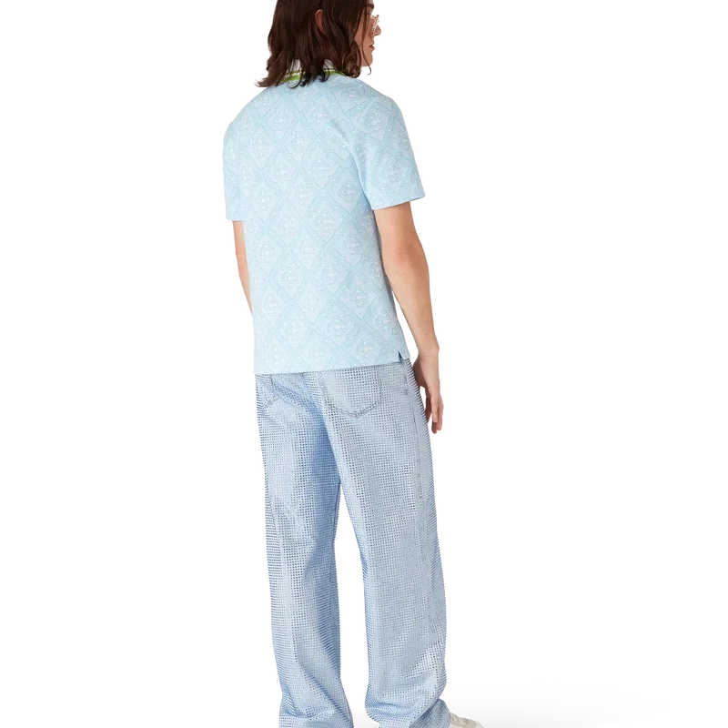 La camisa de manga corta de jacquard azul claro es un diseño clásico que presenta el monograma característico de la casa. Se completa con un cuello acanalado con detalle de ribete a rayas en contraste, cierre de botones y botones de corozo con el logotipo CC entrelazado.