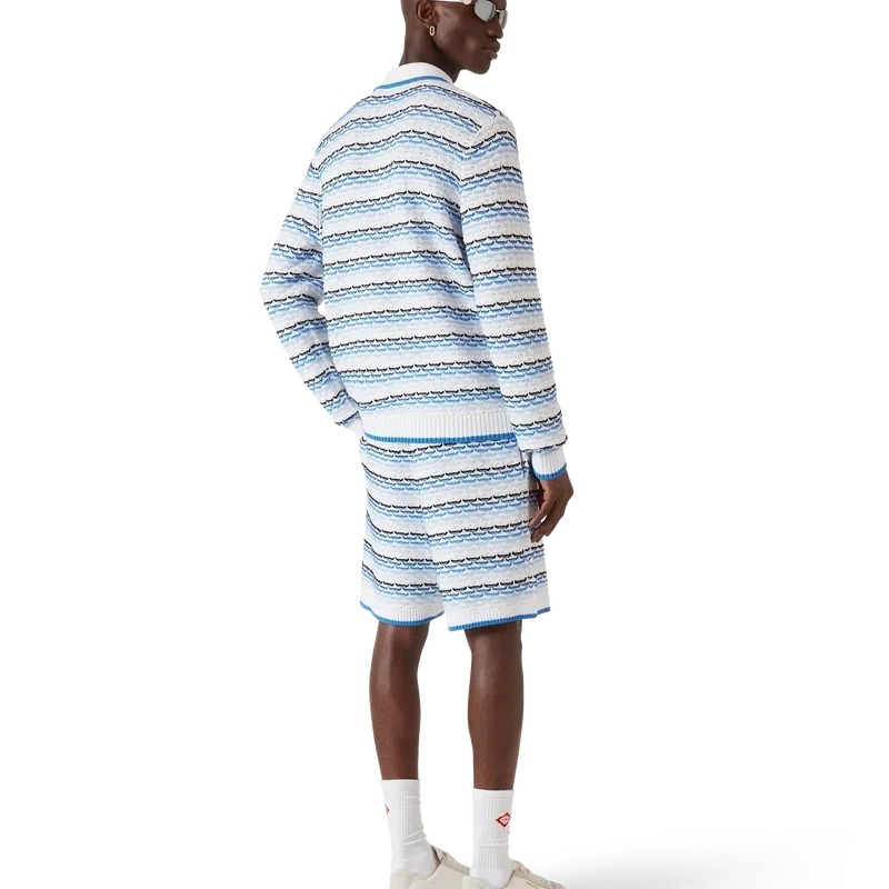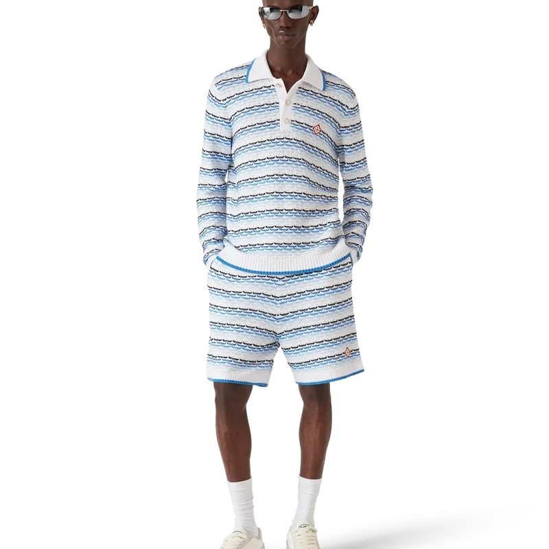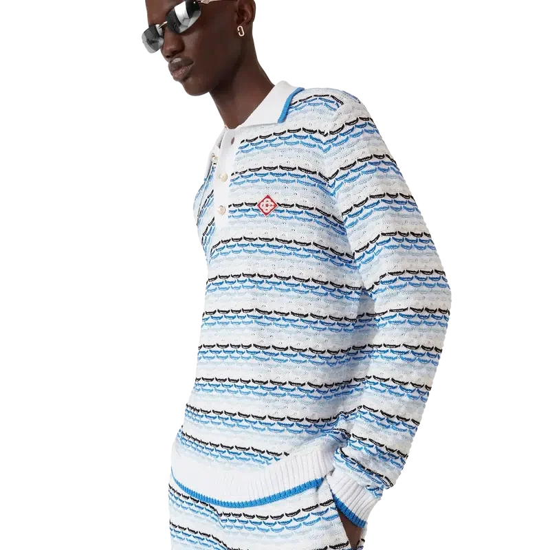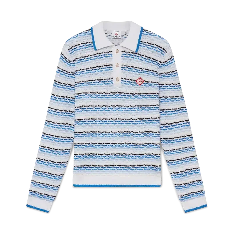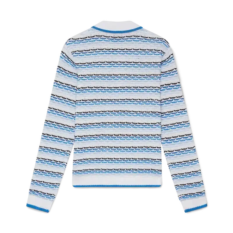 El polo de manga larga con costura plisada es un diseño de punto que presenta el logotipo del diamante característico de la casa. Se completa con cierre de botones, botones de perla con borde dorado característicos y cuello, puños y dobladillo acanalados con detalles en los bordes.