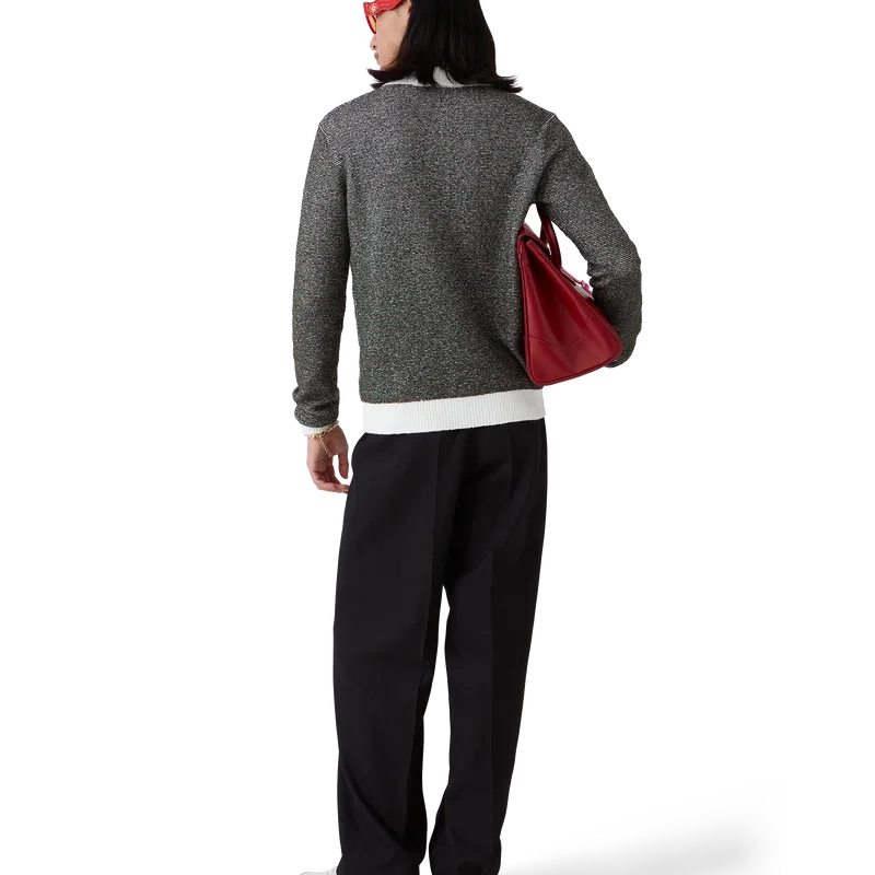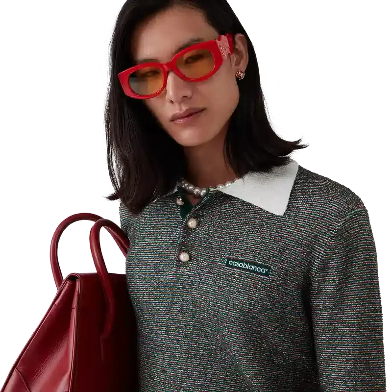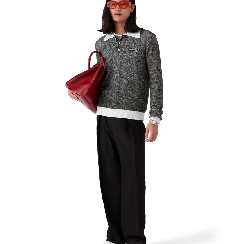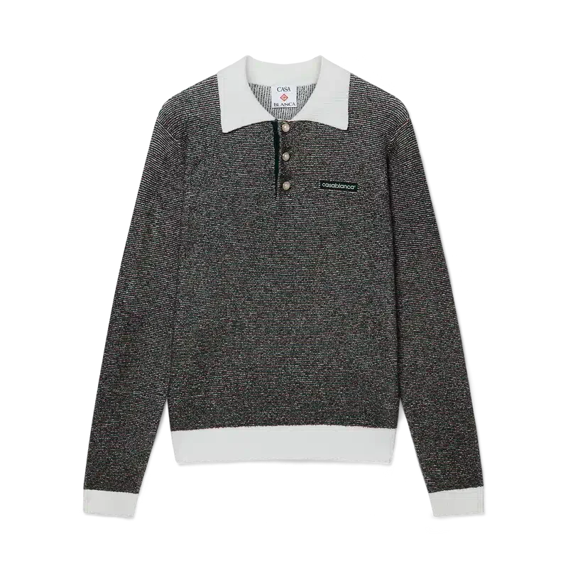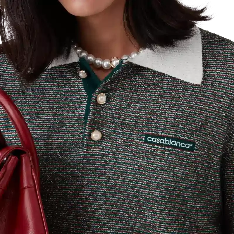 El polo de rayas bouclé es un diseño de manga larga confeccionado en tejido de rayas bouclé con el logotipo Casablanca de la casa. Se completa con una tapeta de tres botones, botones de perla con borde dorado característicos y tapeta, dobladillo, puños y cuello acanalados en contraste.