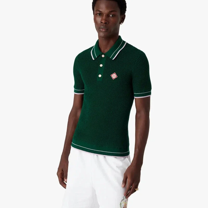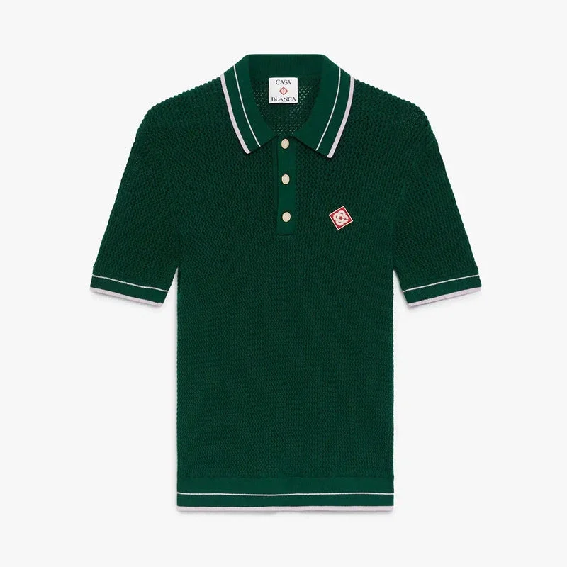 El polo verde de croché de manga corta presenta un diseño refinado confeccionado con un tejido de punto abierto. Se completa con cuello en V acanalado, puños y dobladillo con detalle de bordes a rayas, cierre de botones, botones de perla con borde dorado característicos y el logotipo Casablanca de la casa.
