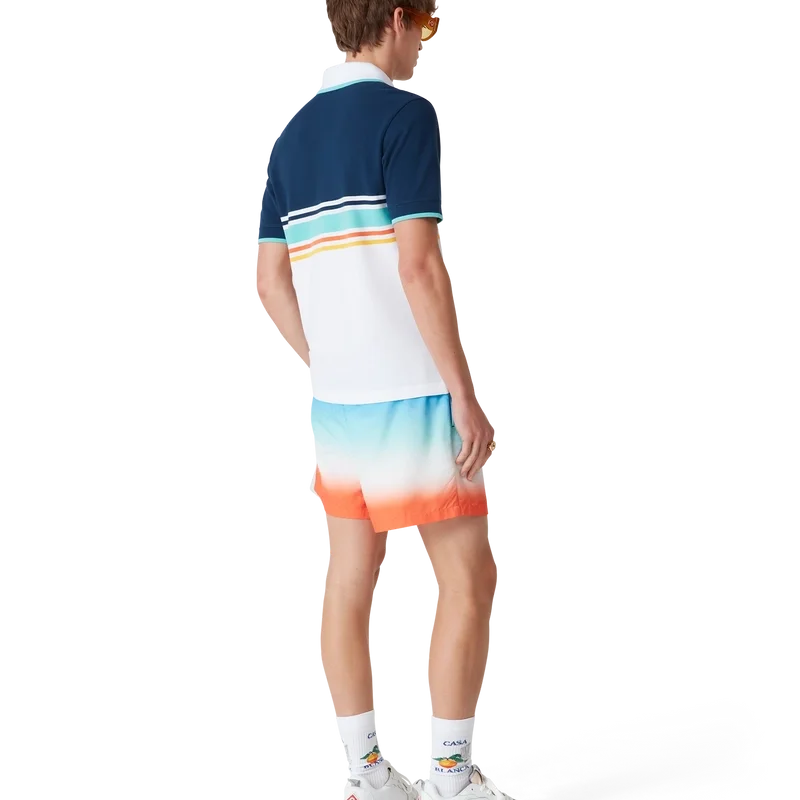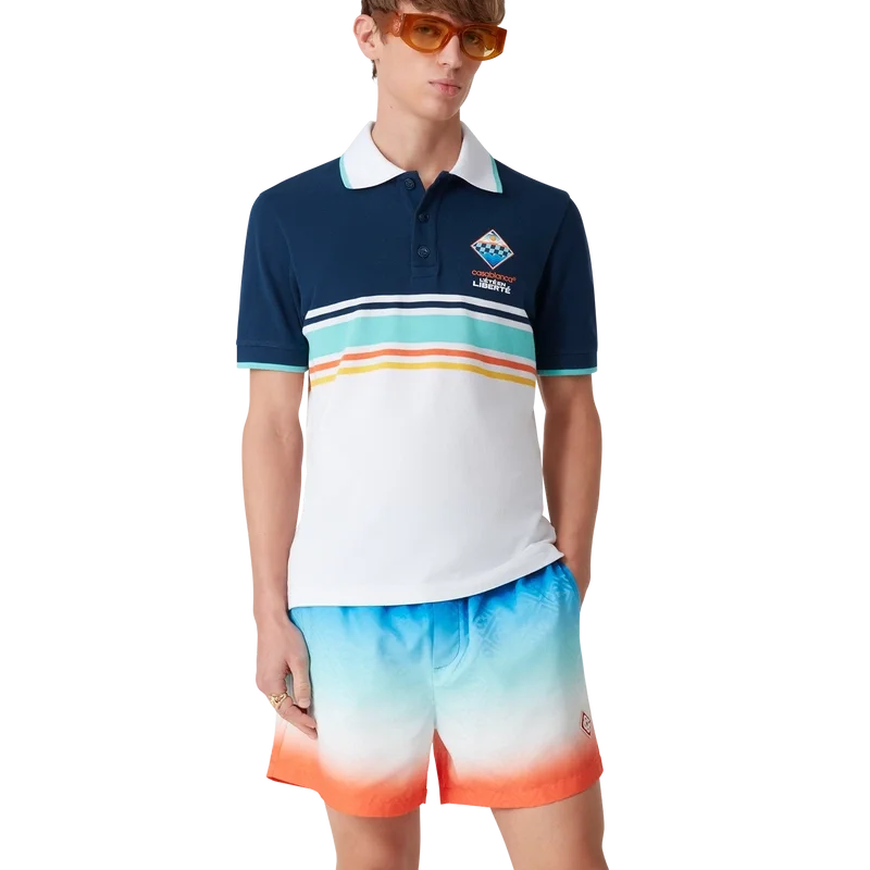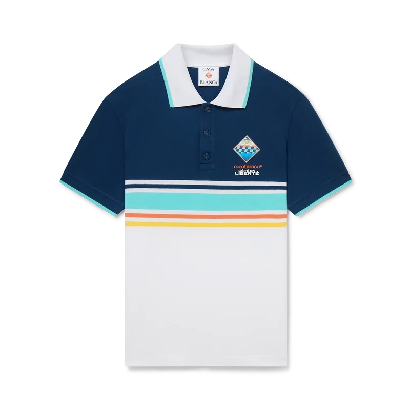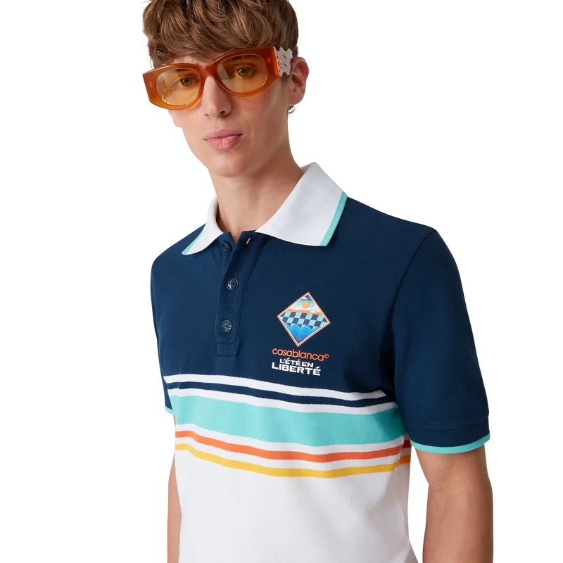 El polo L’ÉTa En Liberta es un diseño de manga corta confeccionado en algodón orgánico, que presenta el diseño de temporada de la marca en un parche con forma de diamante. Se completa con un cierre de tres botones con botones de corozo con el logotipo Cc entrelazado, un cuello acanalado con detalle de borde en color aguamarina y detalles de rayas en naranja, amarillo, azul marino, aguamarina y blanco en el pecho.