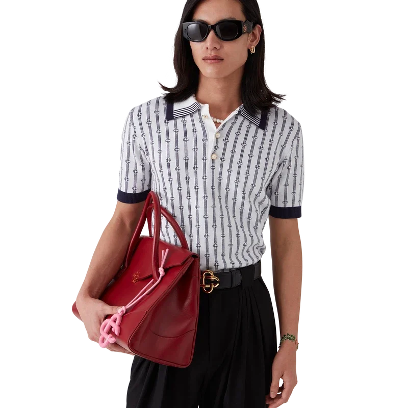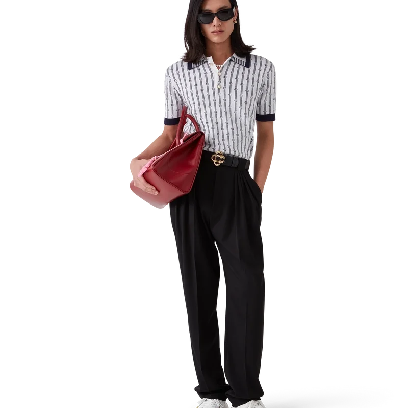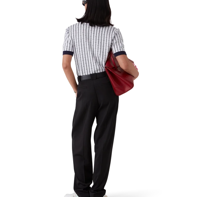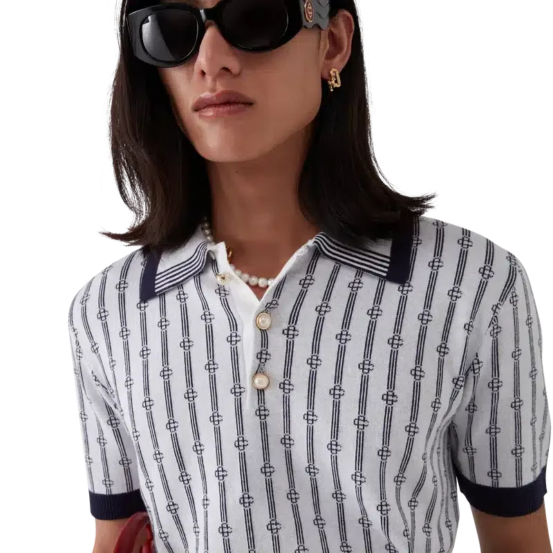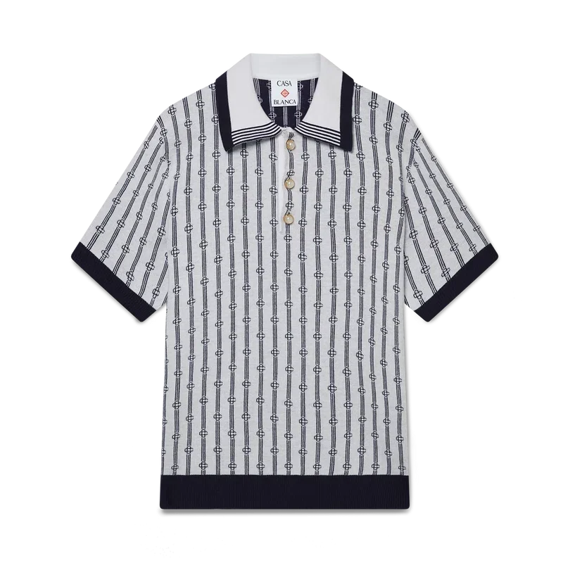 El polo Monogram es un diseño de manga corta confeccionado en tejido de mezcla de algodón con una clásica tapeta de tres botones. Se completa con los característicos botones de perla con borde dorado de la casa, puños acanalados, dobladillo y cuello con detalle en los bordes.