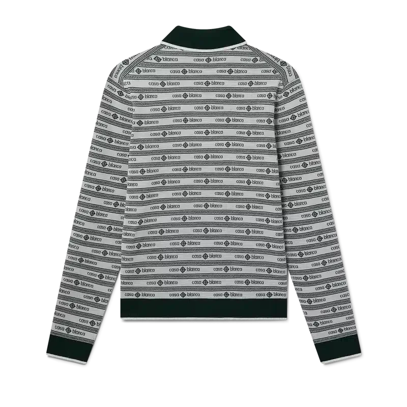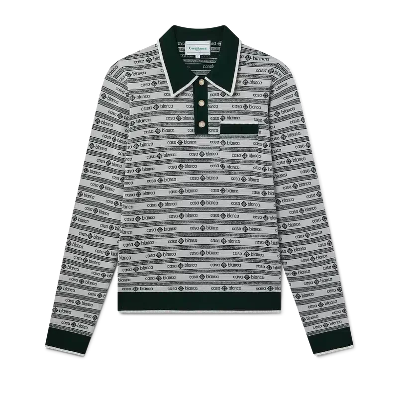 La camisa con el logotipo Evergreen es un diseño de manga larga que presenta el logotipo Casablanca de la casa, confeccionado en tejido de lana merino. Se completa con botones de perla con borde dorado característicos, un bolsillo en el pecho y detalles de canalé en contraste con ribete blanco en el cuello, los puños, el dobladillo, la tapeta y el bolsillo.