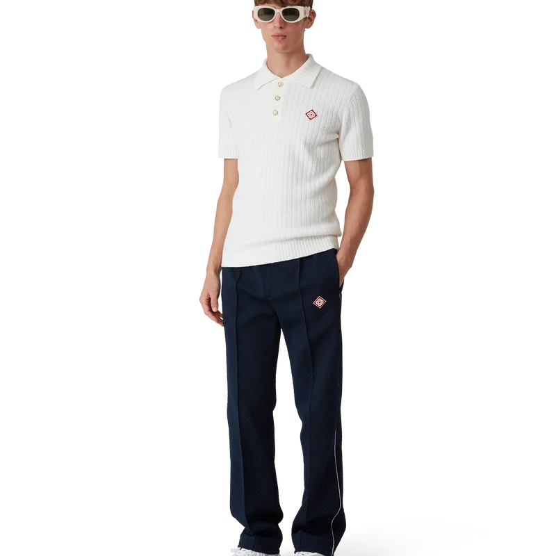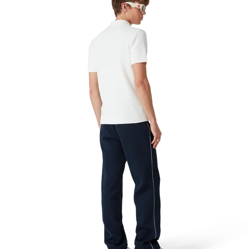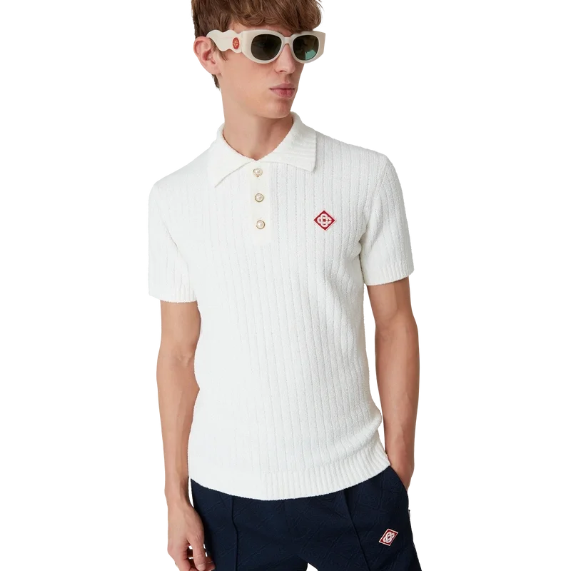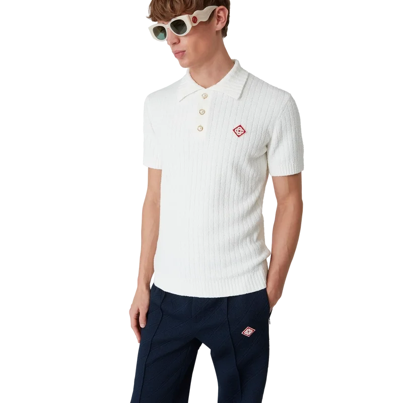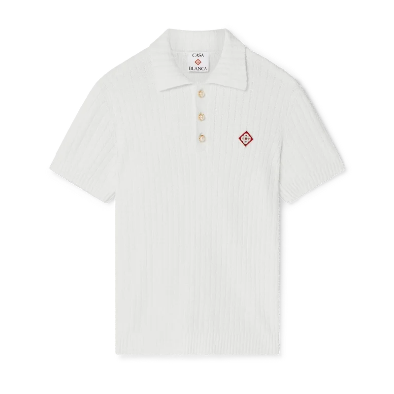 El polo de bouclé es un diseño de textura suave confeccionado en una mezcla de algodón con sutiles detalles acanalados y cuenta con el logotipo de diamante característico de la casa. Se completa con cuello, puños y dobladillo acanalados, y botones de perla con borde dorado característicos.