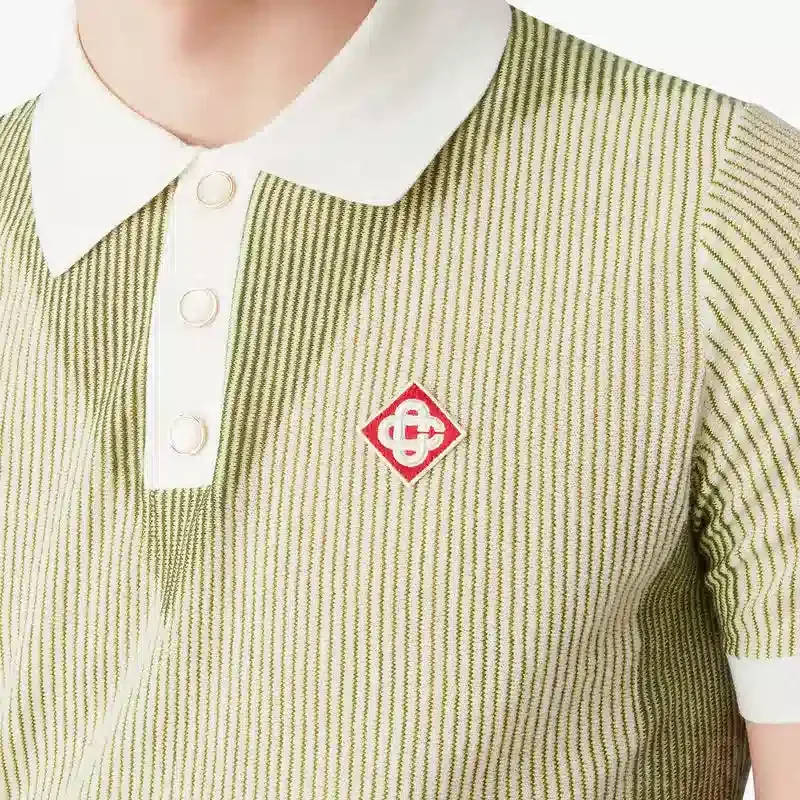 La camisa de manga corta con rayas verticales presenta un diseño de punto refinado y una silueta holgada. Se completa con cuello y tapeta en contraste, cierre de botones, botones de perla con borde dorado característicos de la marca, puños y dobladillo acanalados, y el logotipo de la casa en las mangas.