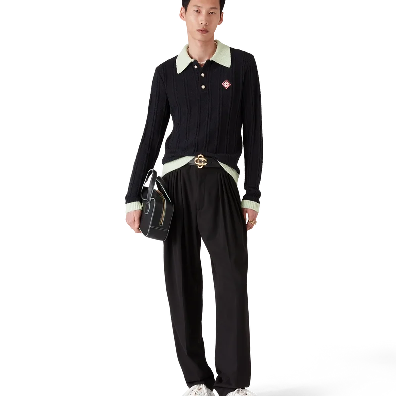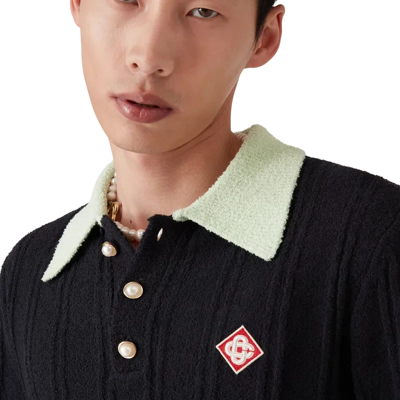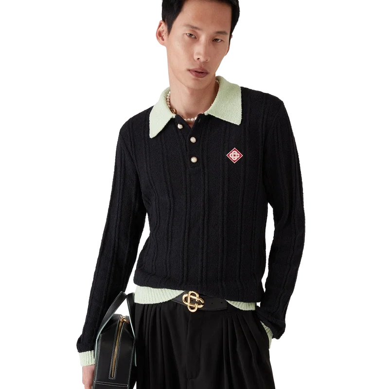 El polo de manga larga Boucle es un diseño de manga larga confeccionado con tejido de bouclé de algodón. Cuenta con cierre de botones, cuello, puños y dobladillo acanalados en contraste.