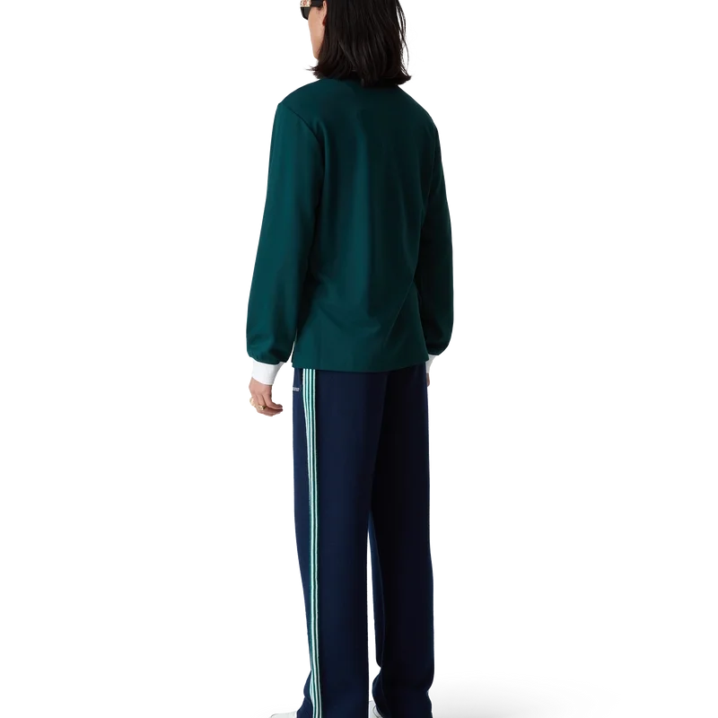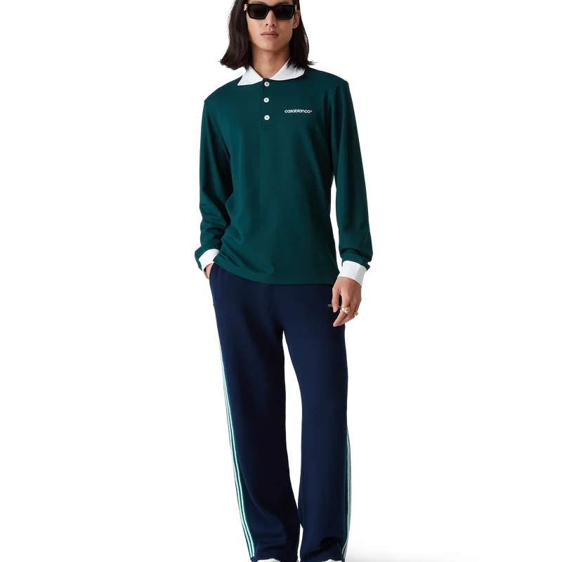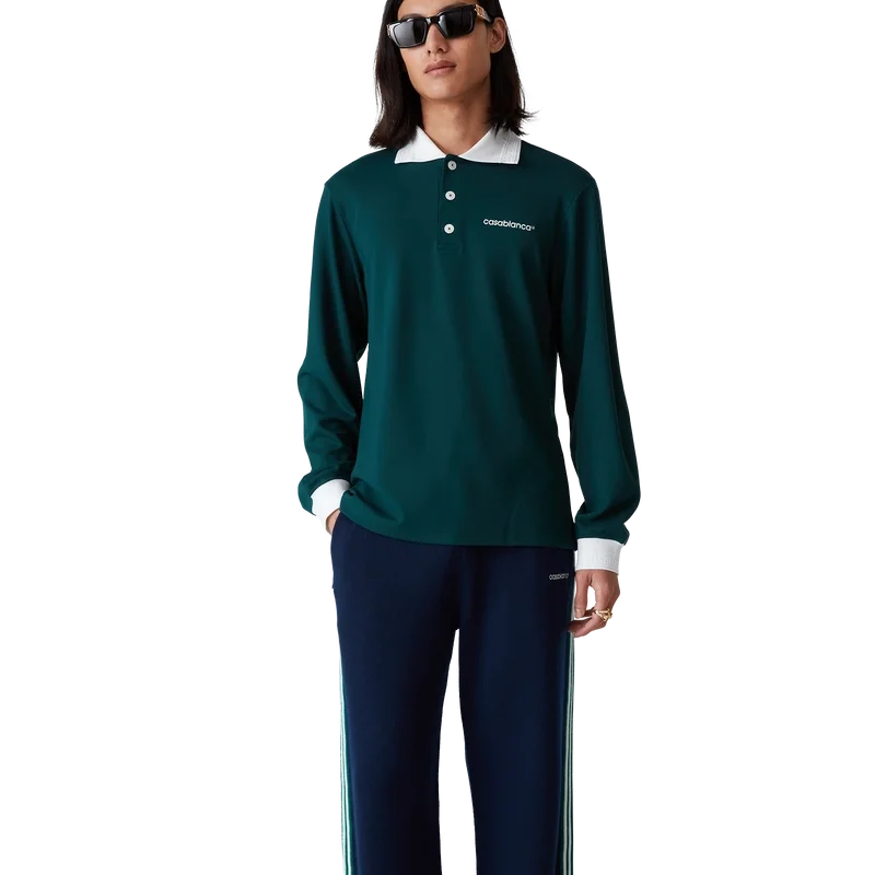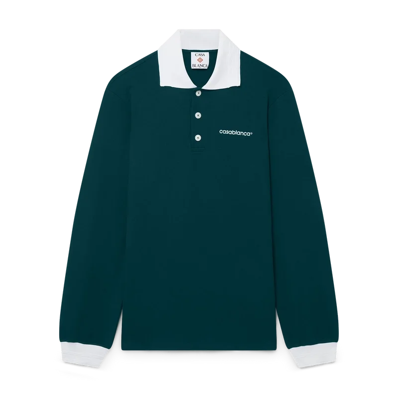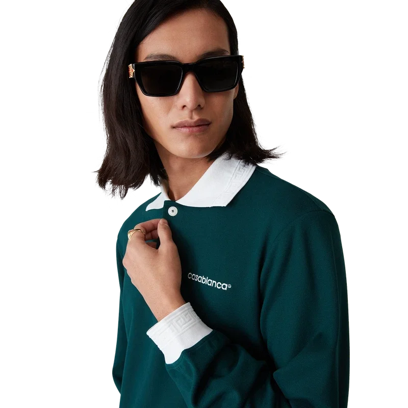 La camisa de manga larga es un diseño clásico confeccionado con un tejido de mezcla de poliéster. Se completa con el clásico cierre de tres botones, cuello y puños acanalados en contraste con detalles en los bordes inspirados en el motivo de la llave griega y el logotipo de Casablanca.