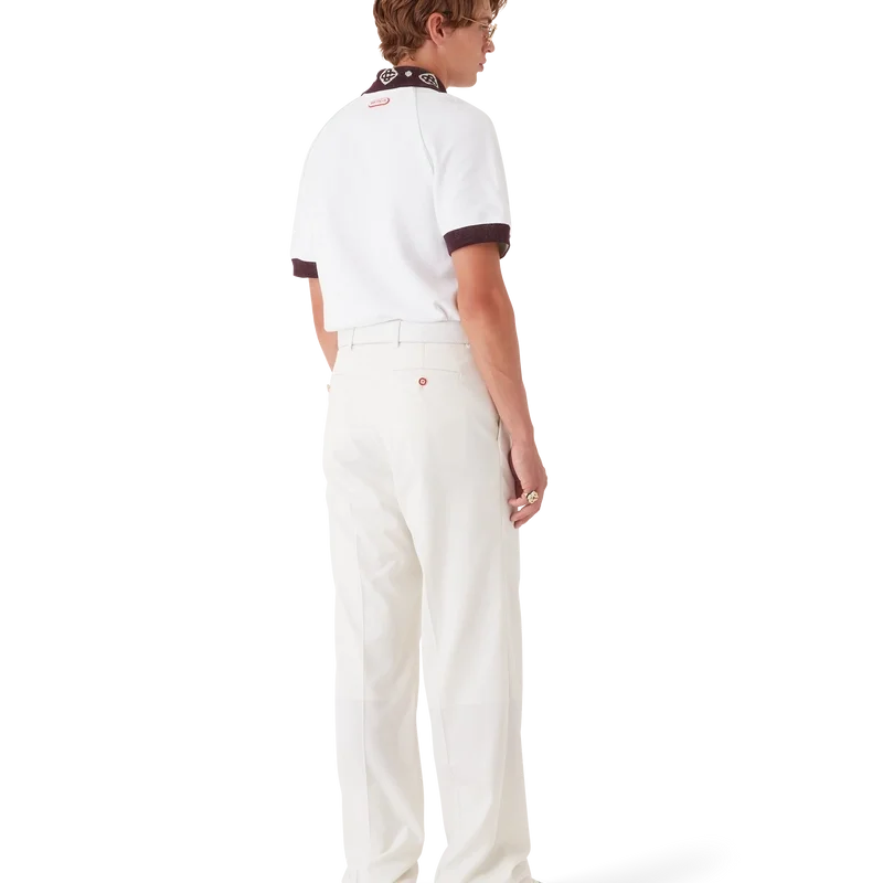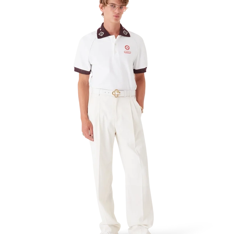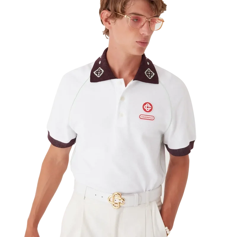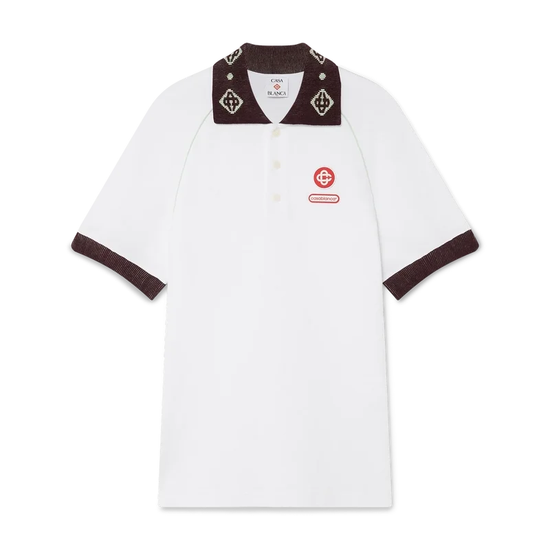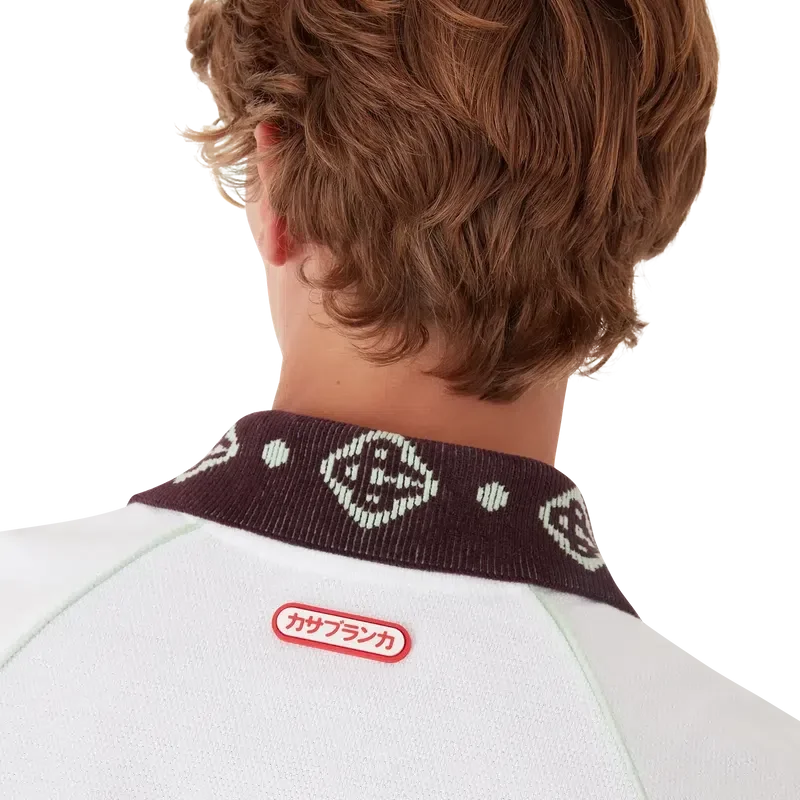 El polo de piqué es un modelo clásico que presenta el logotipo CC de la casa y un parche con el logotipo de Casablanca confeccionado en tejido de piqué de algodón orgánico. Se completa con un cuello de punto en contraste con nuestro emblemático logotipo CC entrelazado, puños en contraste, cierre con tapeta de tres botones, mangas raglán, botones de corozo con el logotipo CC entrelazado y el logotipo de Casablanca debajo del cuello escrito en japonés.