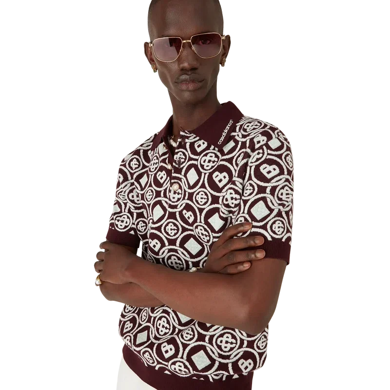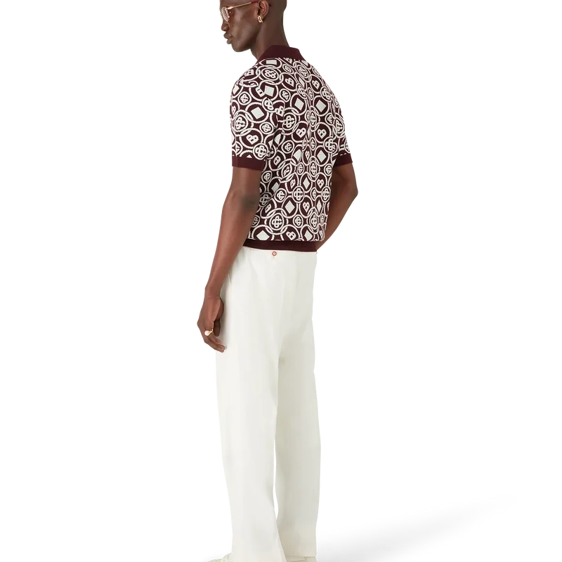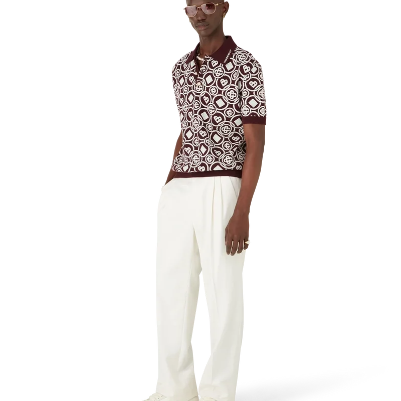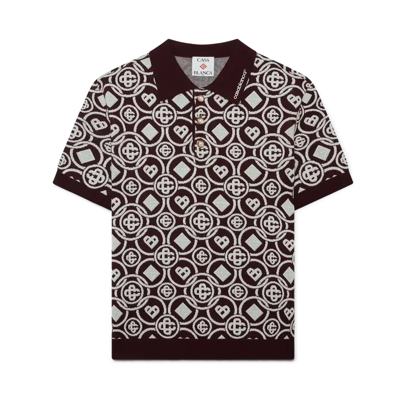 El polo de punto de algodón con monograma es un diseño de manga corta que presenta el nuevo logotipo repetido Honeydrew de la temporada. Este motivo repetido difiere de nuestros otros monogramas, ya que combina formas únicas para formar un patrón cohesivo. Se trata más bien de un diseño basado en iconos. Se completa con cierre de botones, botones de perla con borde dorado característicos y detalles de cuello, puños y dobladillo acanalados.
