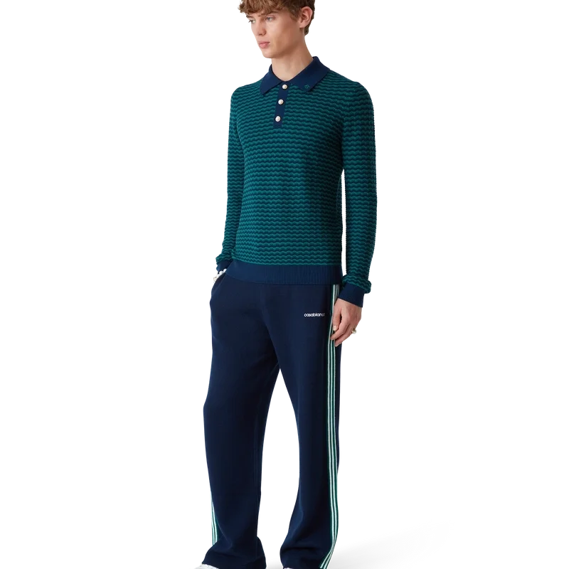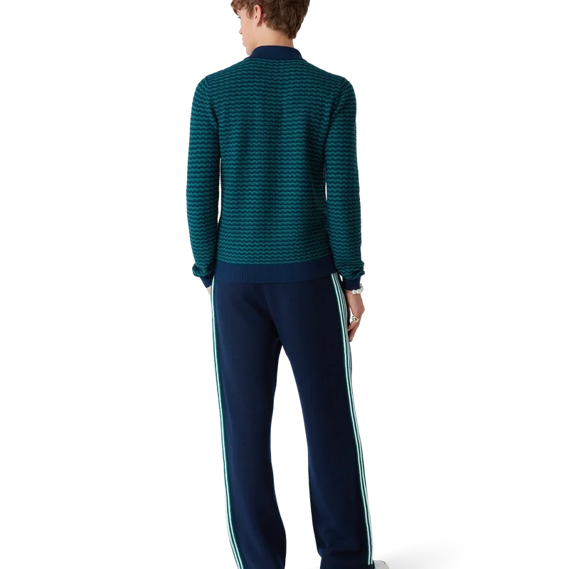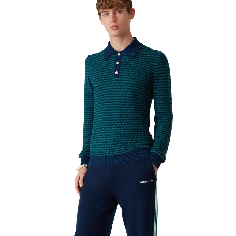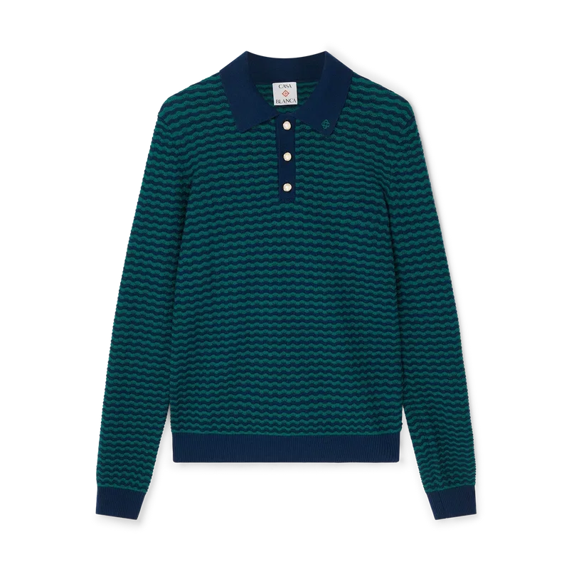 La camisa Mini Wave es un diseño clásico de manga larga confeccionado en tejido de lana merino. Se completa con cuello, puños, dobladillo y tapeta acanalados, y botones de perla con borde dorado característicos.