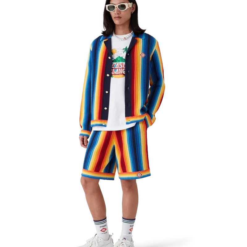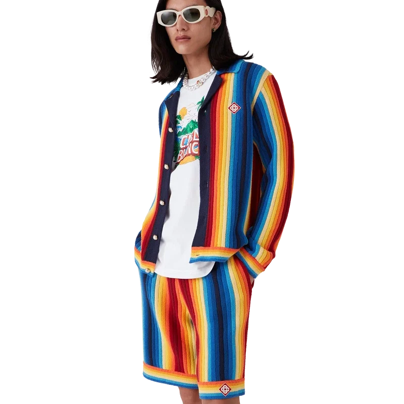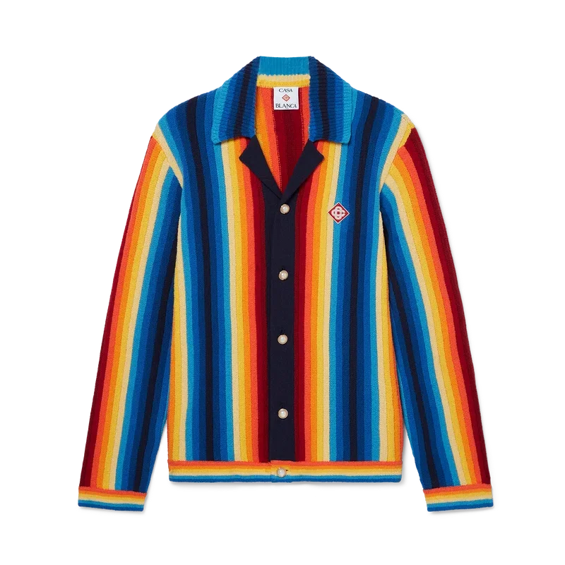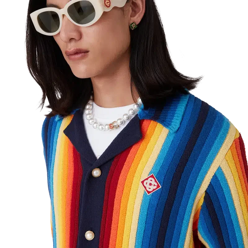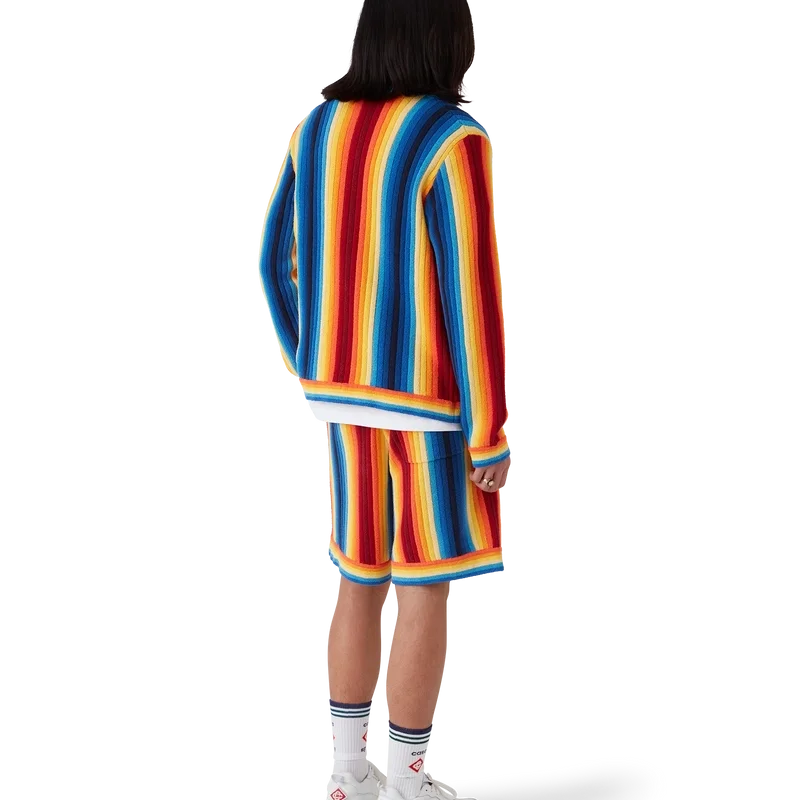 La chaqueta de rizo con rayas degradadas es un diseño de manga larga confeccionado en tejido de rizo de punto degradado. Cuenta con cierre de botones, botones de perla con borde dorado característicos y detalles de cuello, puños y dobladillo acanalados.