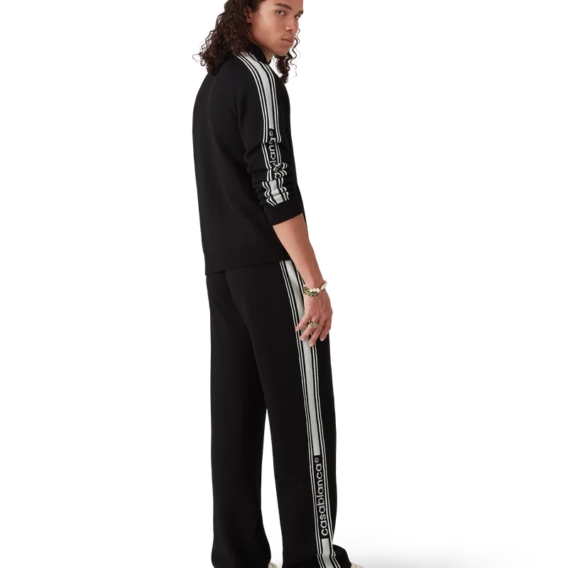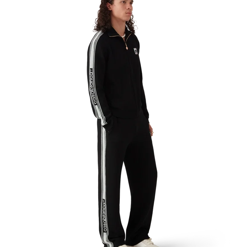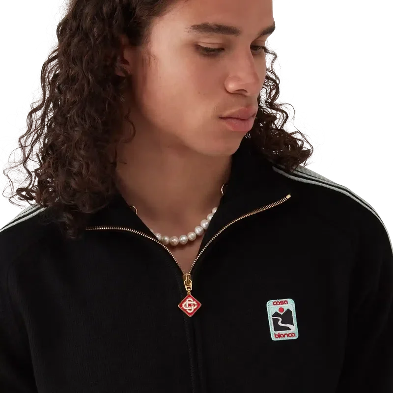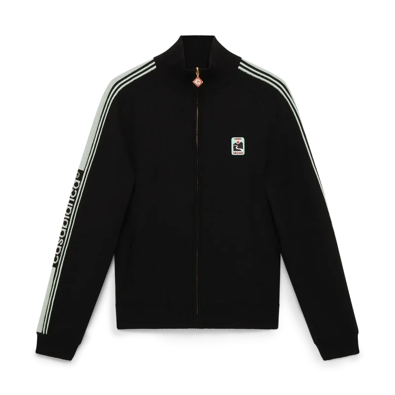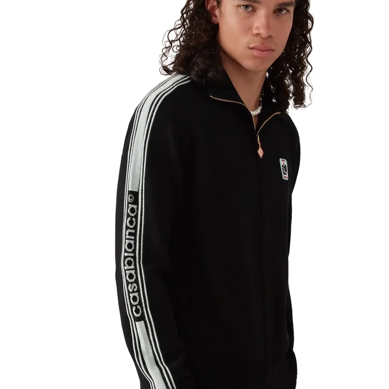 La chaqueta deportiva de punto merino es un diseño de manga larga confeccionado en tejido de lana merino. Cuenta con cierre de cremallera, detalle de tapeta en contraste, cuello polo, detalles de rayas en las mangas, puños y dobladillo acanalados, y el logotipo de Casablanca.