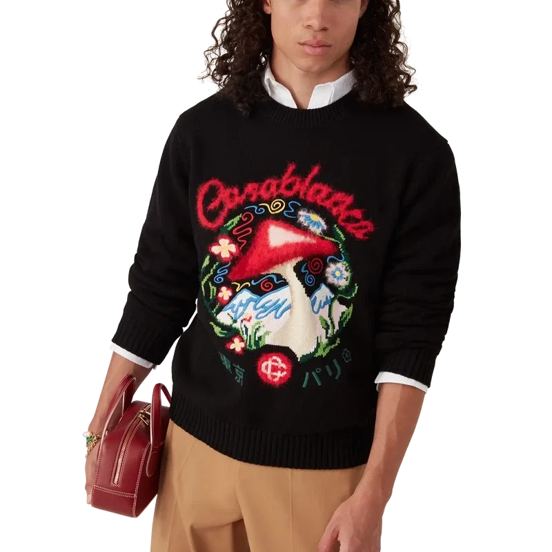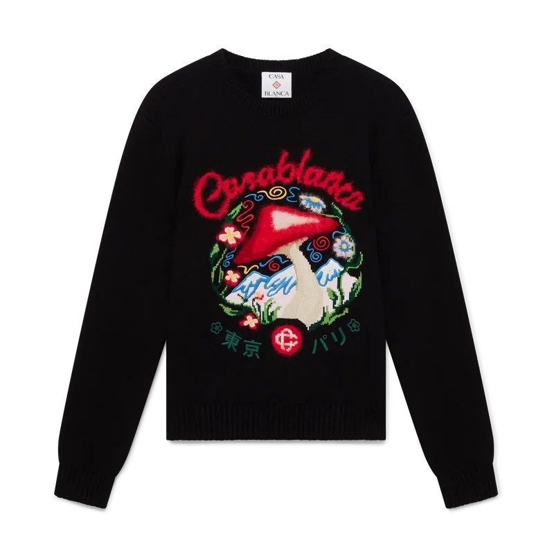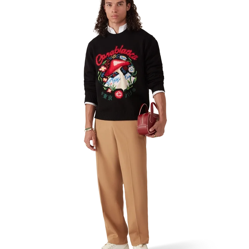 El suéter de algodón con bordado de setas es un diseño de manga larga que presenta uno de los elementos de diseño característicos de la casa —la seta— confeccionado en tejido de algodón. Se completa con un cuello redondo clásico, puños y dobladillo acanalados.