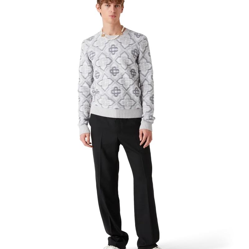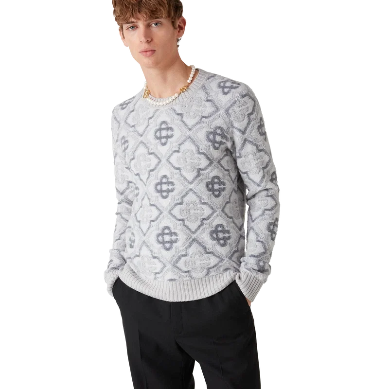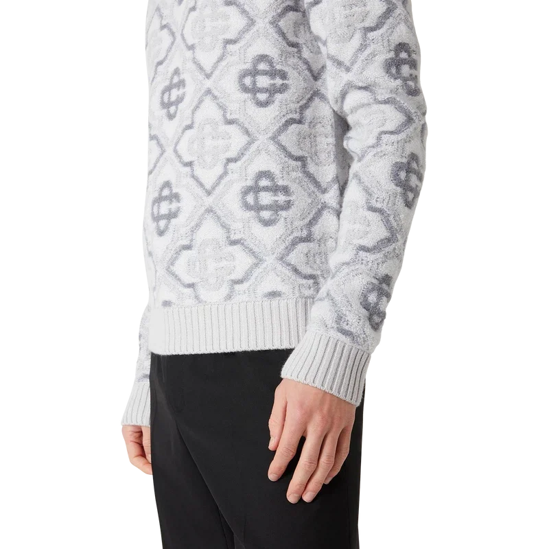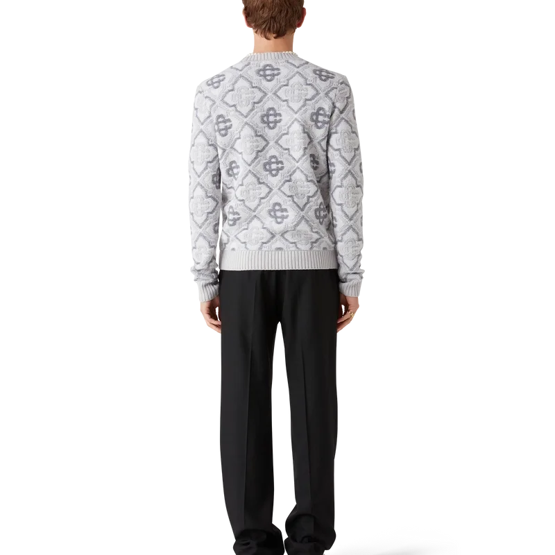El suéter de punto con monograma es un diseño clásico que presenta el monograma característico de la casa, confeccionado en una mezcla de lana. Se completa con un clásico cuello redondo acanalado, puños y dobladillo.