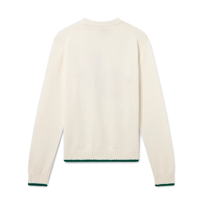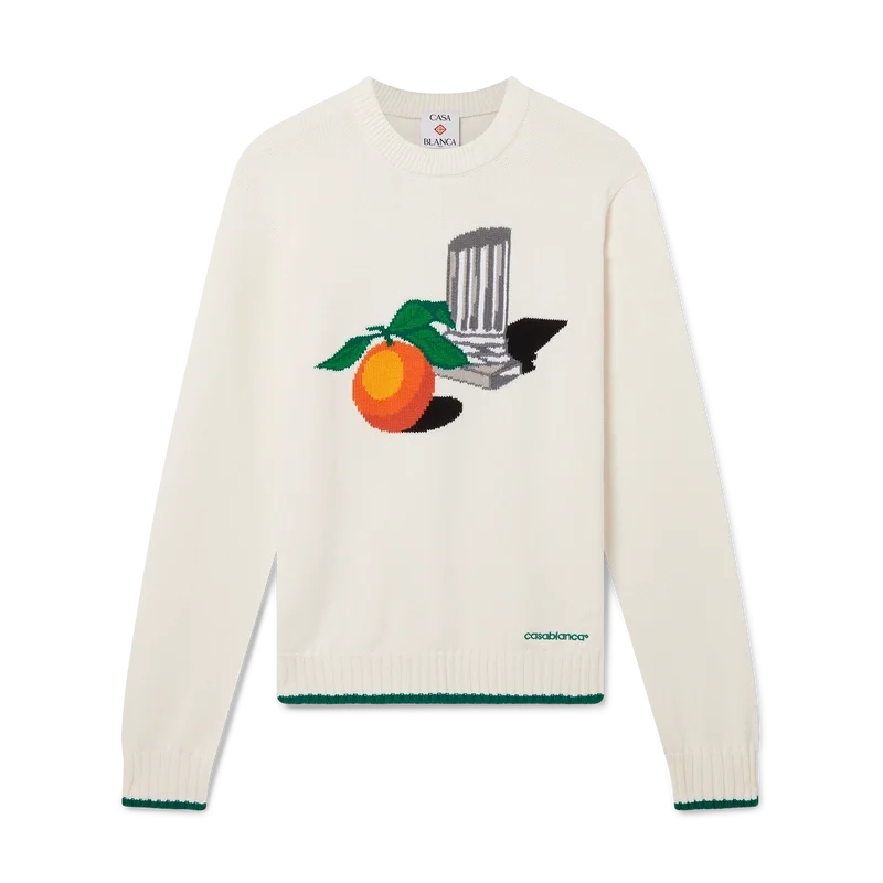 El suéter Intarsia es un diseño de punto blanco de manga larga que presenta el motivo de temporada de la casa, inspirado en la Antigua Grecia, y el elemento de diseño característico de la casa —el naranja—, confeccionado en tejido de algodón transpirable. El estilo se completa con un cuello redondo clásico, cuello acanalado y puños y dobladillo con detalles de bordes en contraste.