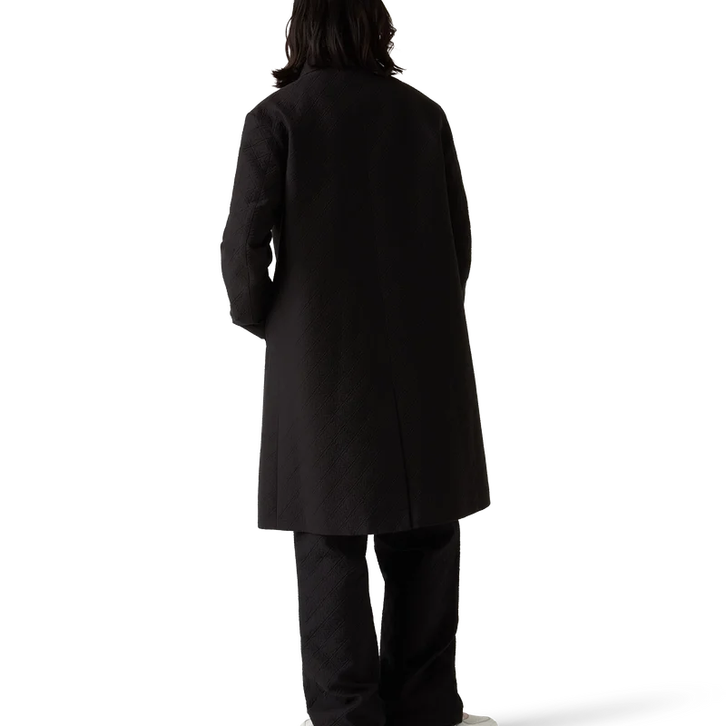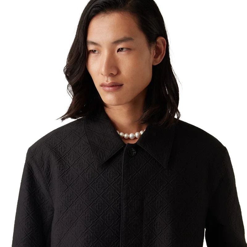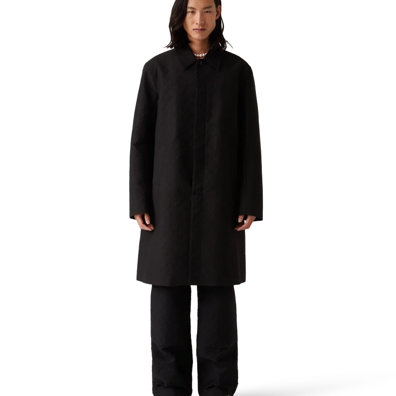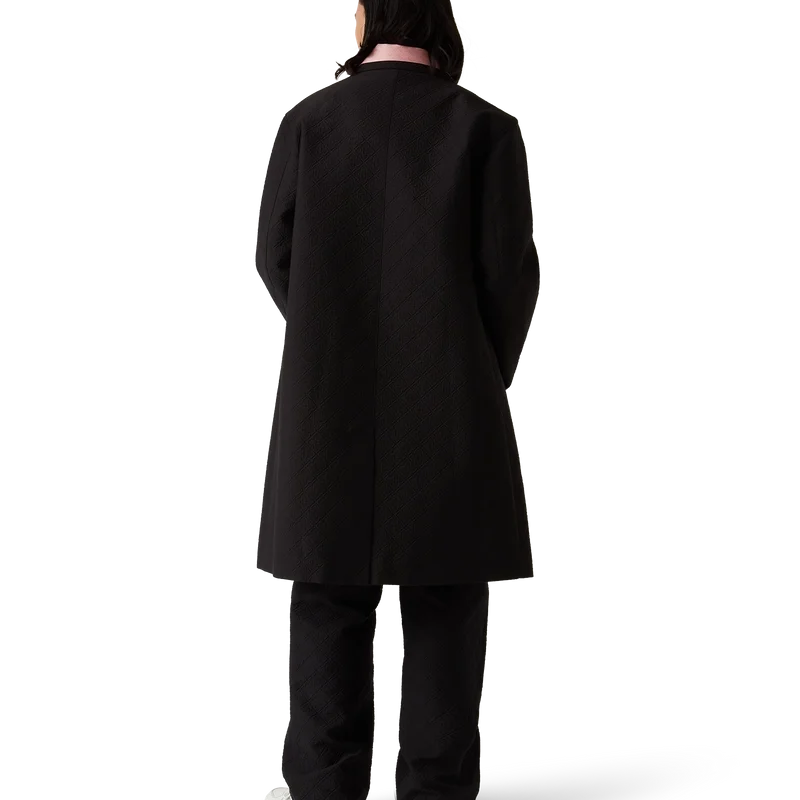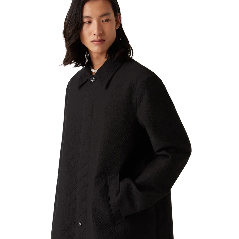 El abrigo de coche jacquard es un abrigo de largo medio confeccionado en un tejido de mezcla de algodón jacquard, con el Diamond Monogram característico de la casa. Se completa con cierre frontal de botones, botones a presión chapados en oro con el logotipo de la marca, forro, cuello de embudo, bolsillos laterales verticales y abertura trasera. 52 % viscosa, 48 % algodón