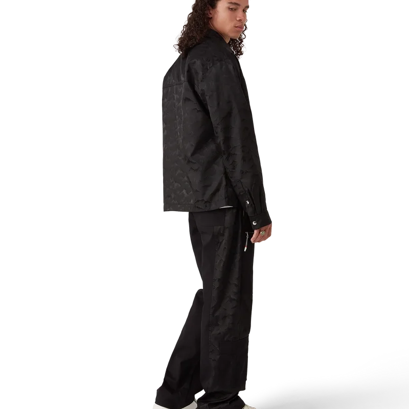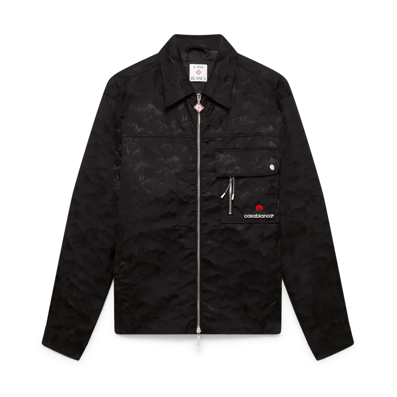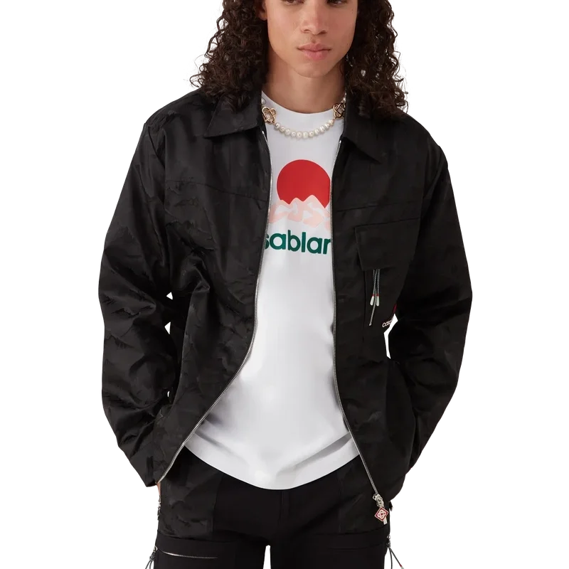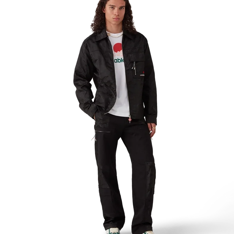 La camisa de nylon Mountain Camo con cremallera es un diseño de manga larga confeccionado en tejido jacquard con el logotipo de diamante característico de la casa. Se completa con cuello en punta, cierre de cremallera con la lengüeta con el logotipo del diamante característico de la casa, un bolsillo con solapa en el pecho con cremallera vertical y cordones inspirados en los de las cuerdas de alpinismo de esta temporada, herrajes con la marca en los puños y el bolsillo, y el logotipo «Casa Montagne» de la casa, un logotipo que a primera vista parece una montaña, pero que al mirarlo más de cerca se lee como «Casa».