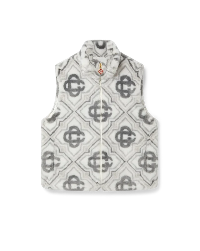 El chaleco de piel sintética con monograma es un diseño sin mangas, lujoso y de textura suave, confeccionado en tejido jacquard de piel sintética con el logotipo Diamond Monogram de la casa. Se completa con cierre de cremallera frontal, bolsillos laterales verticales con ribete, forro y cuello de banda.