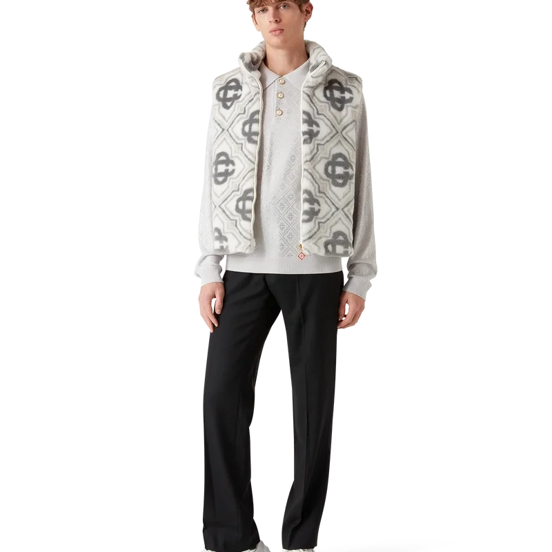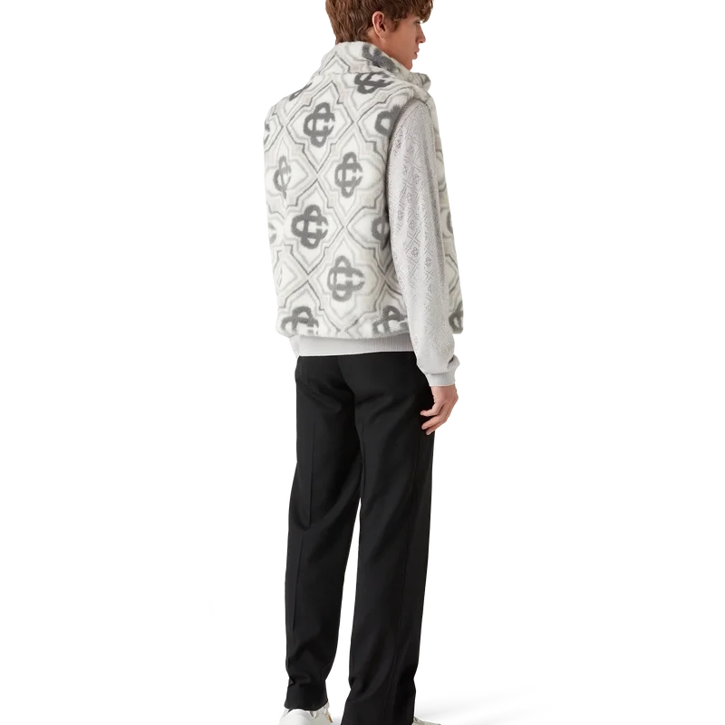 El chaleco de piel sintética con monograma es un diseño sin mangas, lujoso y de textura suave, confeccionado en tejido de piel sintética jacquard con el logotipo Diamond Monogram de la casa. Se completa con cierre de cremallera frontal, bolsillos laterales verticales ribeteados, forro y cuello de banda.