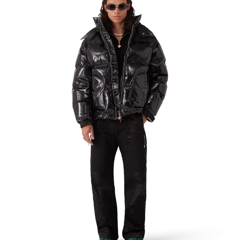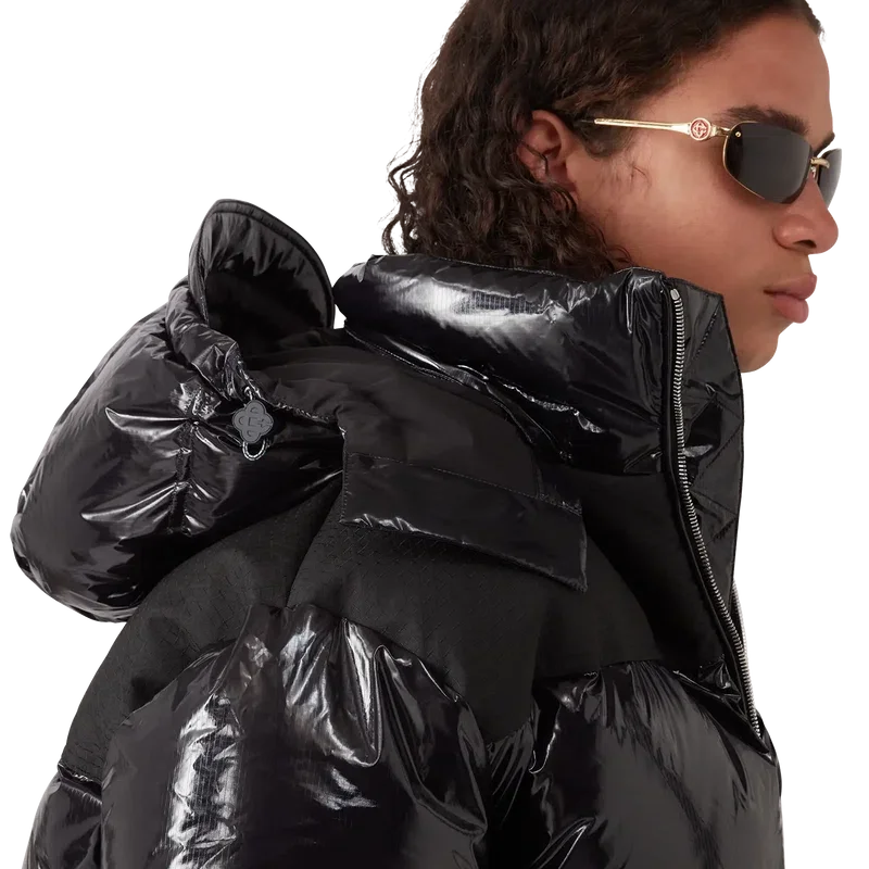 La chaqueta acolchada de nylon es una prenda de ropa de abrigo de diseño moderno y corte cuadrado, confeccionada en tejido de nylon ripstop con relleno de plumón y un panel de jacquard con el monograma en contraste en los hombros. Se completa con una capucha con cordones y cierres con el logotipo de CC, un cuello alto que proporciona calor adicional y protección contra las inclemencias del tiempo, un cierre de cremallera con la lengüeta con el logotipo de diamante característico de la casa, bolsillos delanteros con cierre de cremallera, correas ajustables con el logotipo de la marca en los puños y dobladillos y puños elásticos.