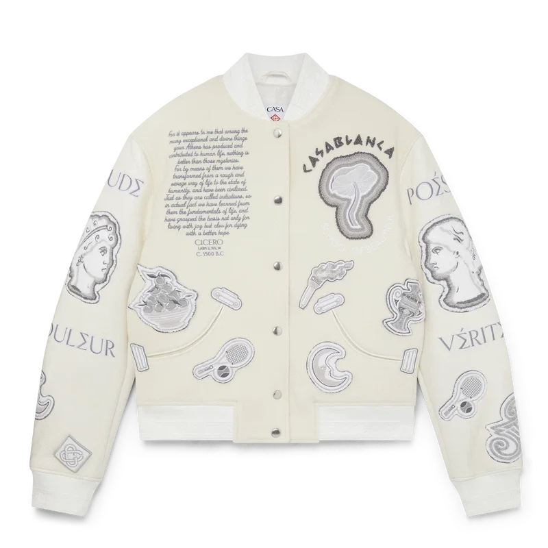 La chaqueta bomber de patchwork de chenilla es una chaqueta de estilo bomber tradicional que presenta iconografías utilizadas en colecciones anteriores, confeccionada en lana virgen y cuero con bordados de letras griegas que muestran la influencia de la Antigua Grecia entrelazada con elementos futuristas y los elementos de diseño característicos de la casa, como el motivo de la hoja de laurel, una raqueta y una pelota de tenis, naranjas y una antorcha.