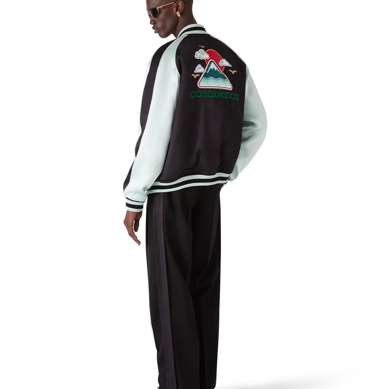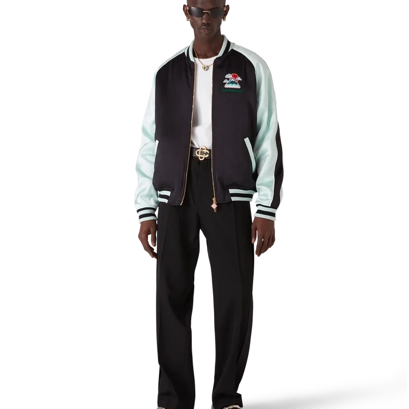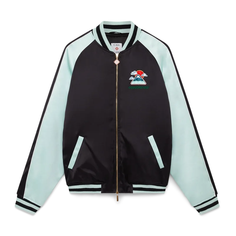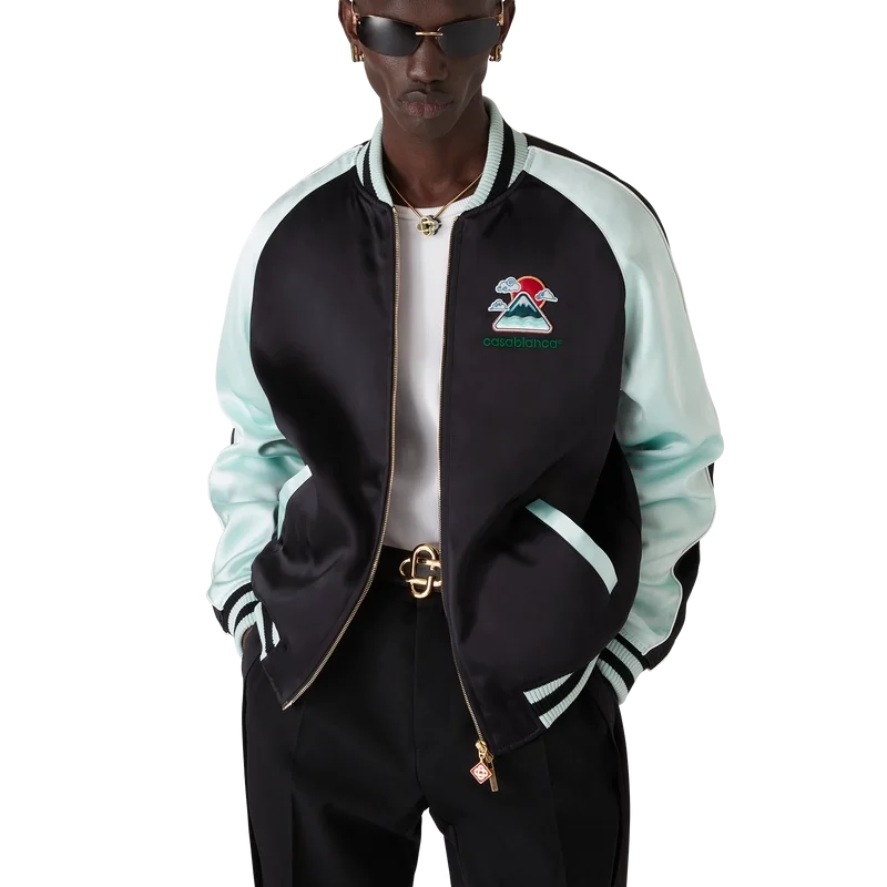 La chaqueta bomber de satén bordada es una chaqueta de estilo bomber tradicional, confeccionada en tejido de satén con motivos inspirados en la rica iconografía japonesa, que transmite un fuerte mensaje visual con solo unas pocas líneas y colores, lo que la convierte en uno de los emblemas de la colección. Se completa con un cierre de cremallera con la lengüeta con el logotipo del diamante característico de la casa, mangas raglán con paneles verdes y negros y detalles de ribetes, forro, bolsillos diagonales con ribete y cuello, puños y dobladillo acanalados con detalles de rayas en color menta y negro.