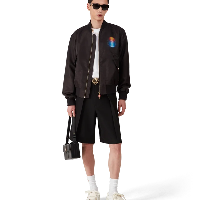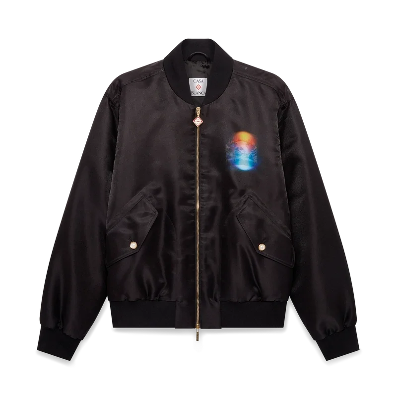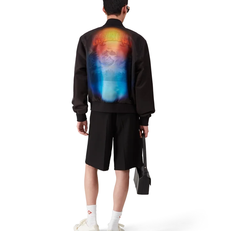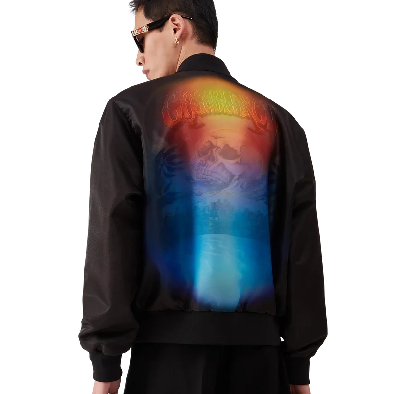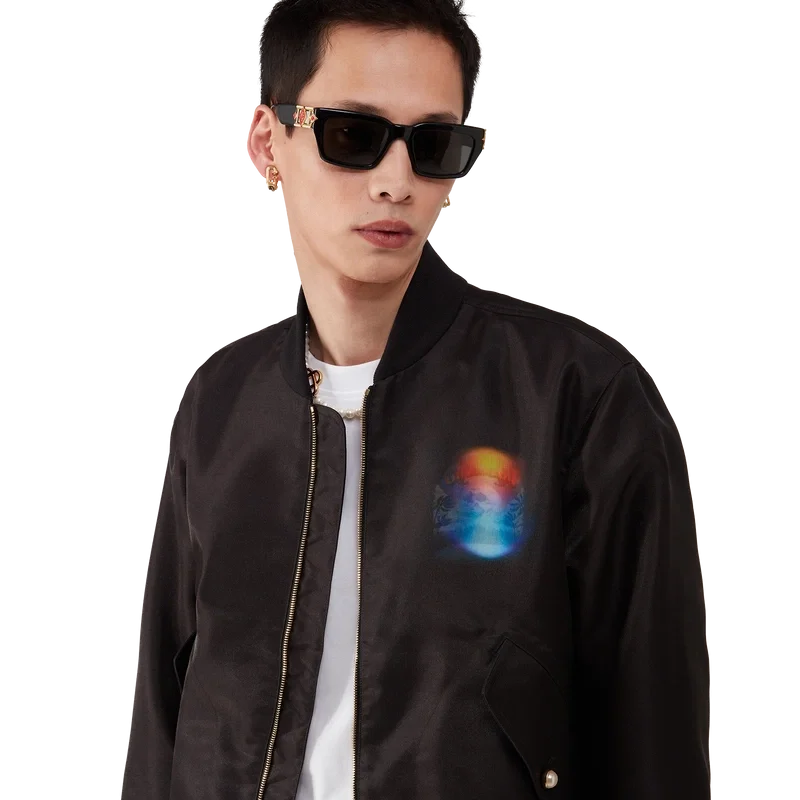La chaqueta bomber degradada de organza presenta una silueta clásica confeccionada en tejido de organza con el degradado de la temporada y el diseño de La Pramonition, que representa una visión inquietante del horizonte de Los Ángeles por la noche, con elementos de ovnis que tocan la inspiración de la ciencia ficción vintage, en el pecho y la espalda. Se completa con cierre de cremallera, bolsillos delanteros con solapa y cierre de botones de perla con borde dorado característico, y cuello, puños y dobladillo de canalé.