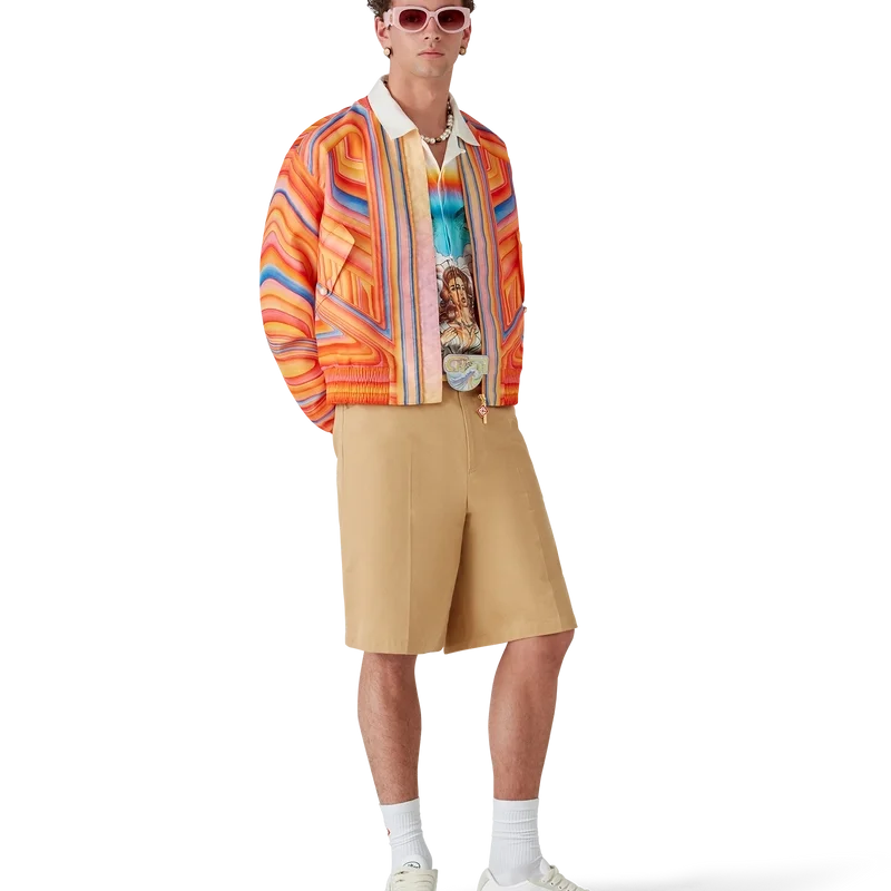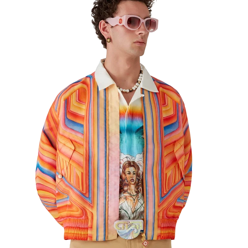 La chaqueta bomber Low Rider de organza presenta un diseño estampado con una silueta clásica, confeccionada en un tejido técnico con el diseño Low Rider de la temporada. Se completa con un cierre de cremallera que luce el logotipo del diamante característico de la casa en la lengüeta, bolsillos con solapa en la parte delantera con cierre de botones de perla con borde dorado característico, y cuello, puños y dobladillo acanalados.