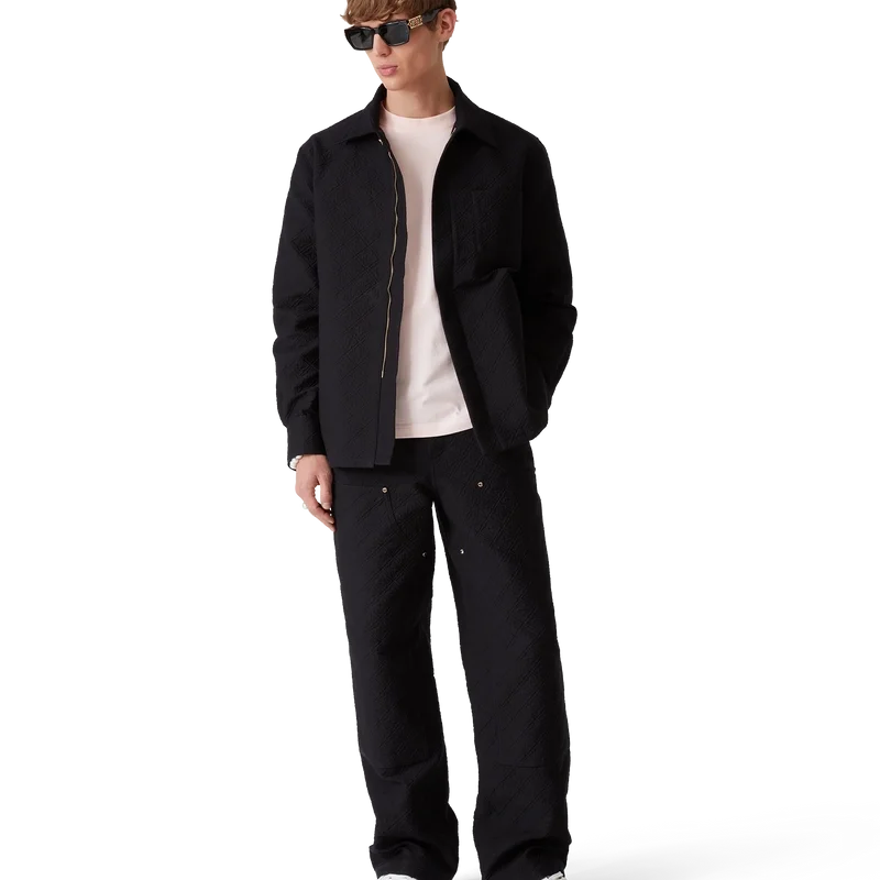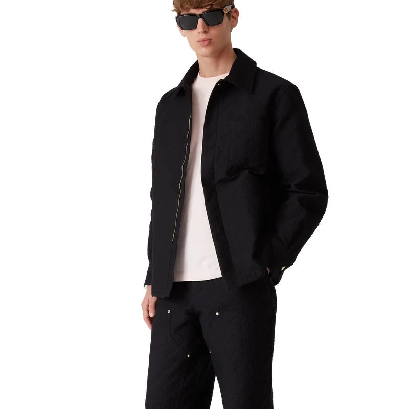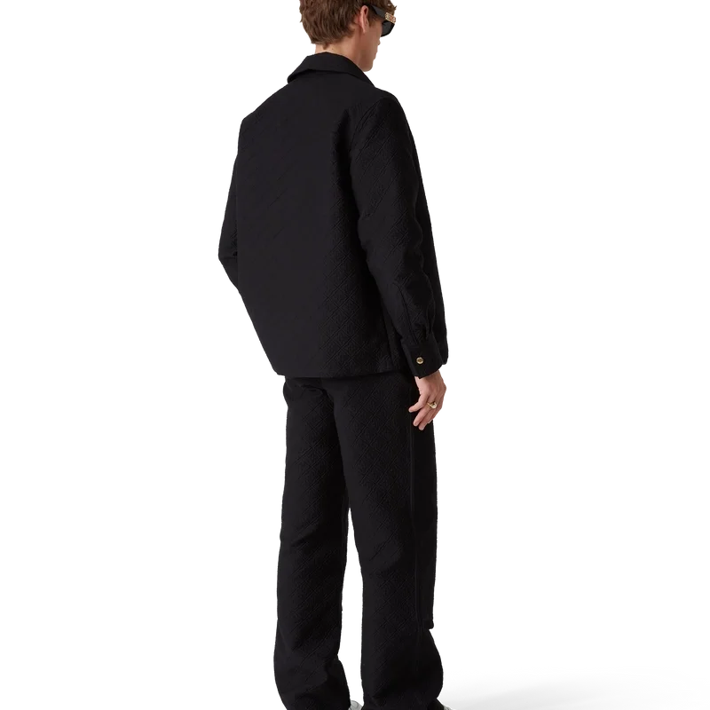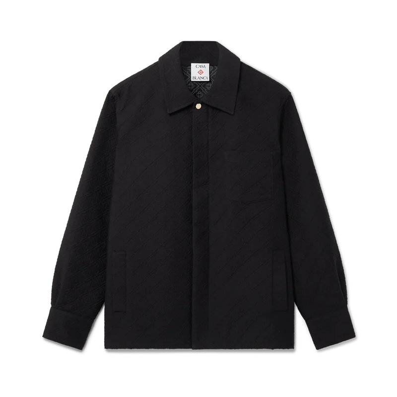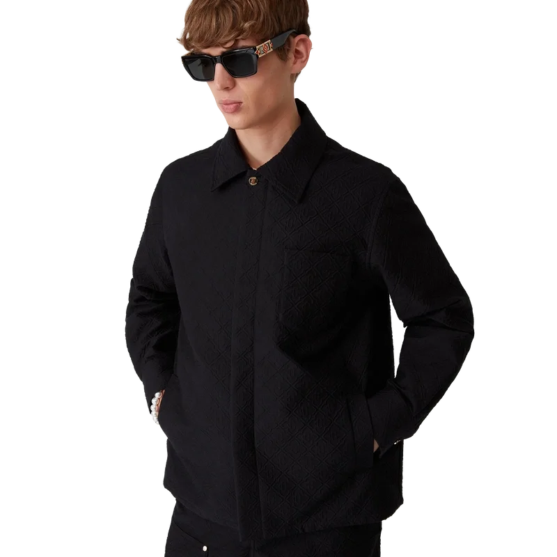 La chaqueta-camisa de jacquard es un diseño de manga larga confeccionado con un tejido de mezcla de algodón y poliéster jacquard. Cuenta con un bolsillo de parche en el pecho, bolsillos verticales ribeteados en la parte delantera, cuello en punta, cierre de cremallera oculto en la parte delantera y botones dorados con la marca en las mangas y el cuello.