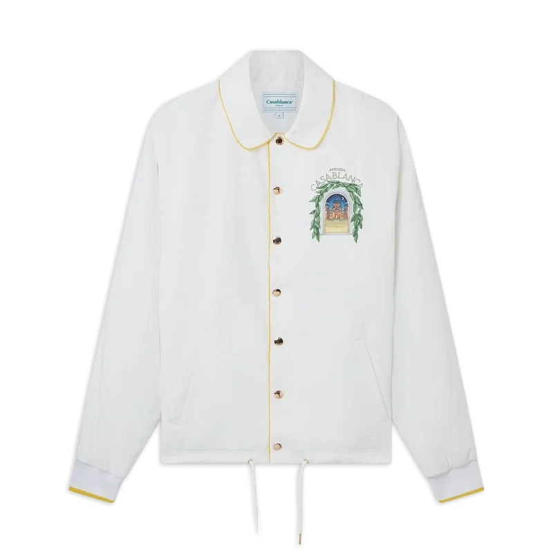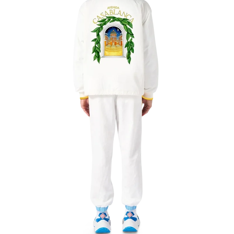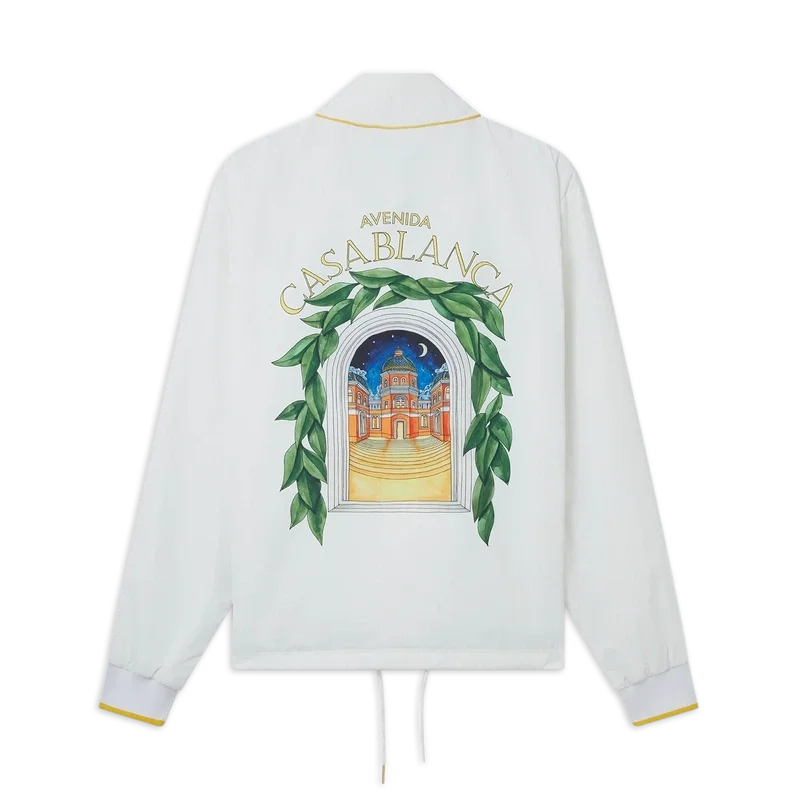 La chaqueta Casablanca Avenida en blanco presenta un estampado clave de la temporada en el que el flujo libre de la naturaleza se une a la estructura del diseño artificial: el arco, un símbolo abstracto de fuerza. Acabada con ribete amarillo, cordones y cierre con botones.