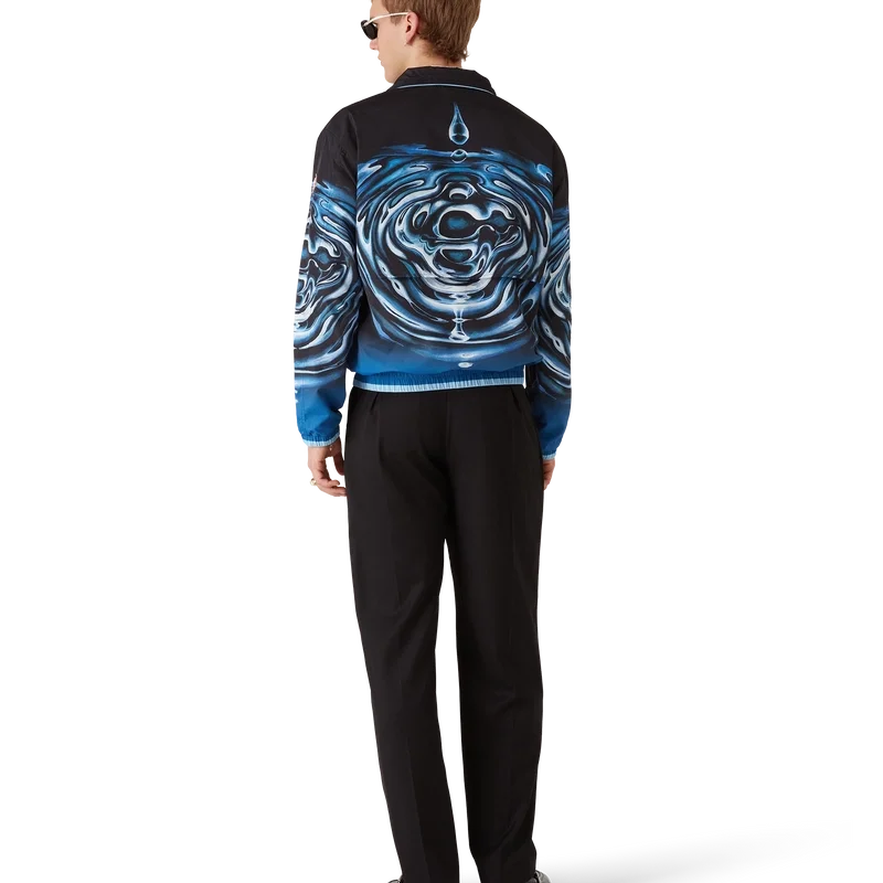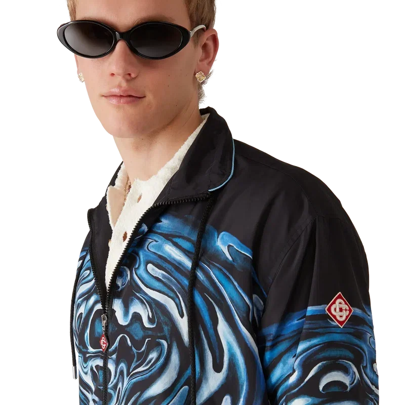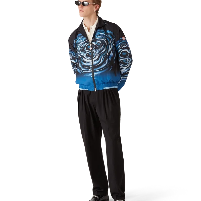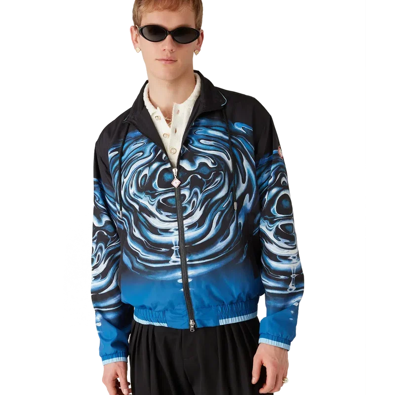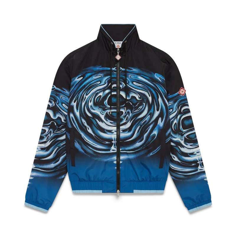 La chaqueta cortavientos con el logotipo Warped es un diseño de manga larga que presenta el logotipo de diamantes característico de la casa y el diseño Water Atlantis de la temporada, una mezcla de elementos digitales y pintados a mano en la que el logotipo CC se representa como ondas en el agua.