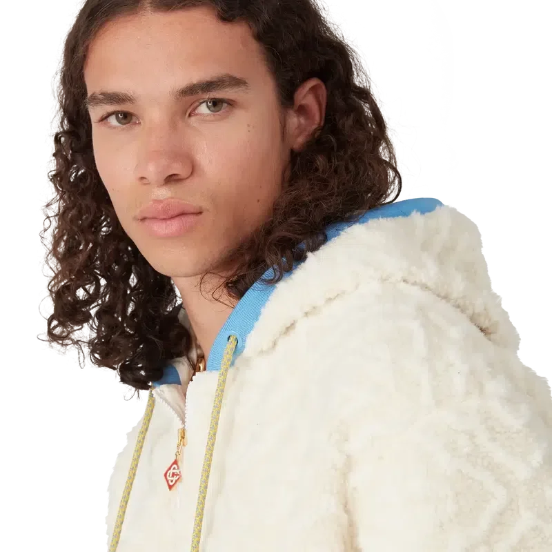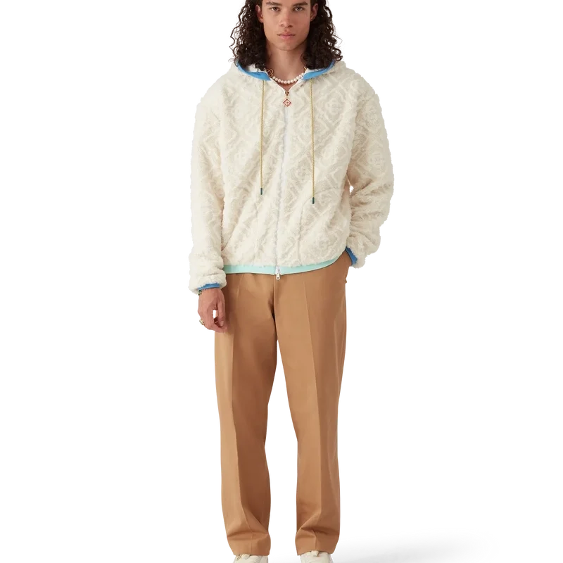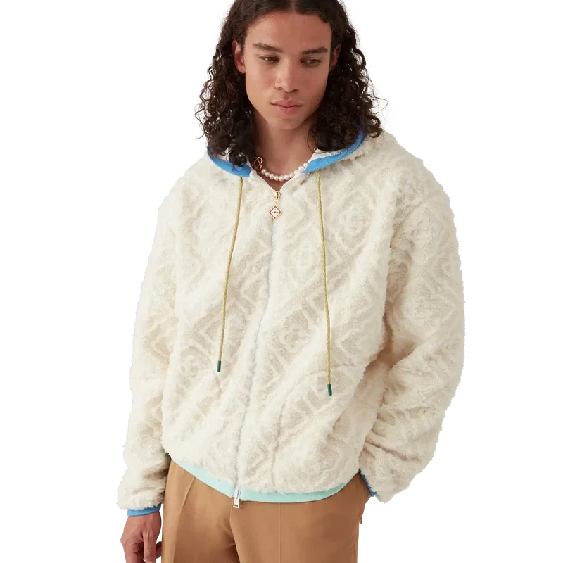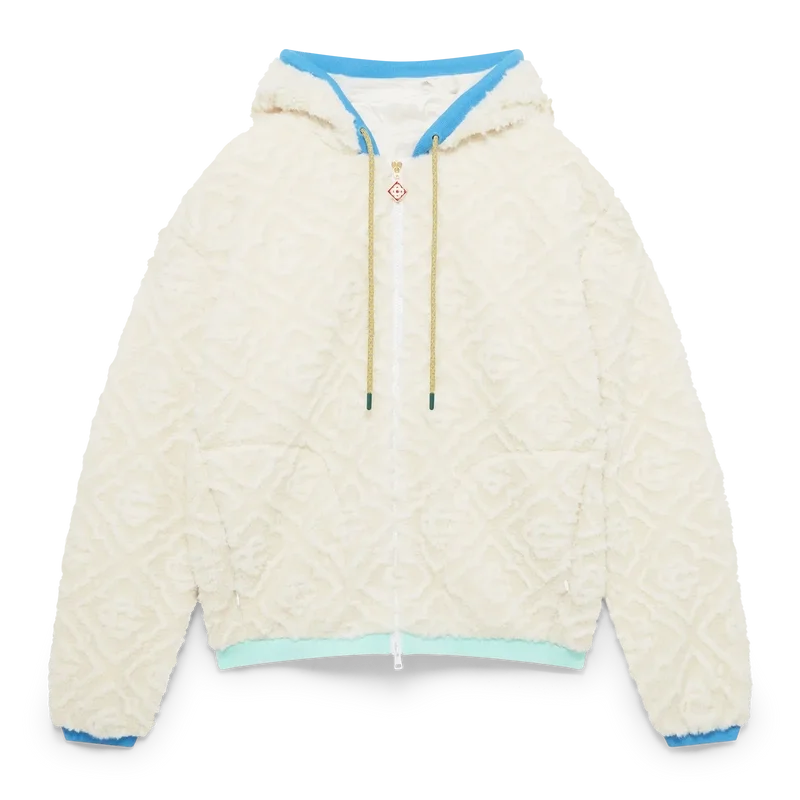 La chaqueta de felpa jacquard Monogram es un diseño de manga larga y textura suave confeccionado en tejido de felpa. Cuenta con capucha, cierre con cordón, cremallera con la lengüeta con el logotipo de diamantes característico de la casa, puños, dobladillo y borde de la capucha acanalados en tonos pastel, y bolsillos con cierre de cremallera.