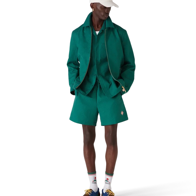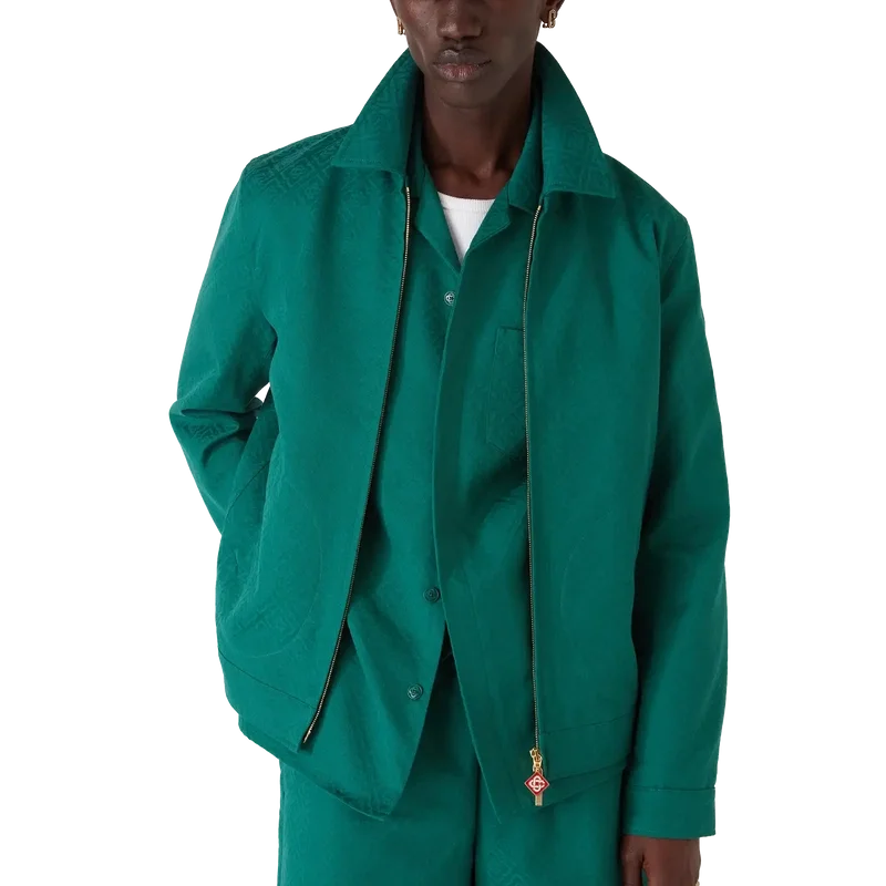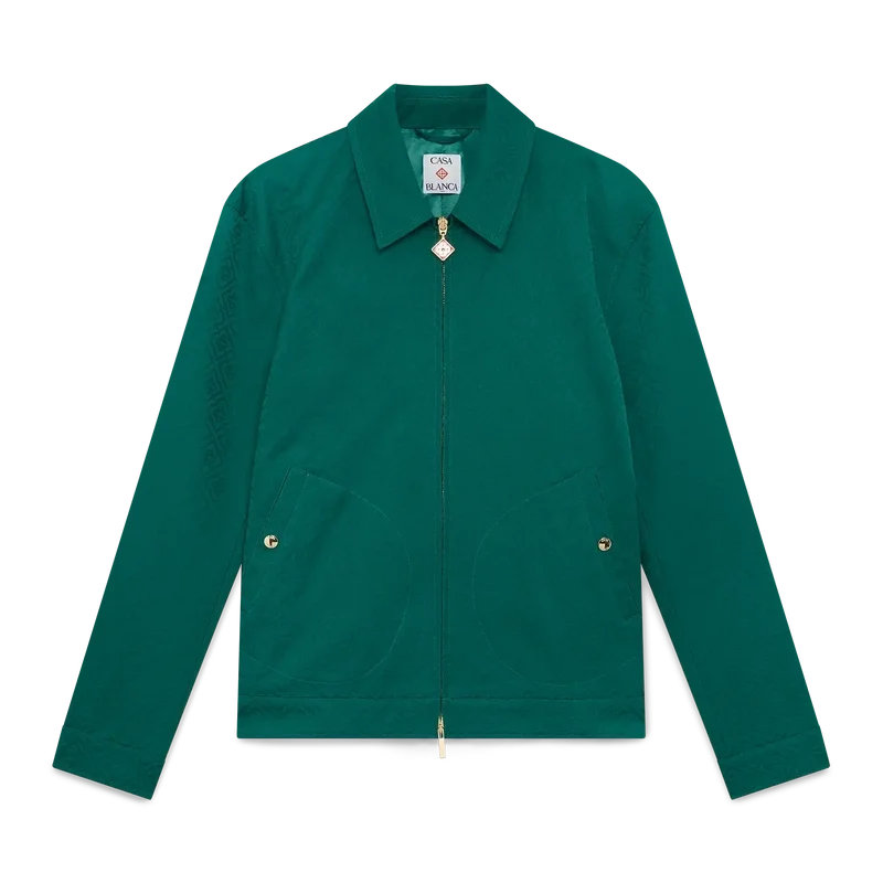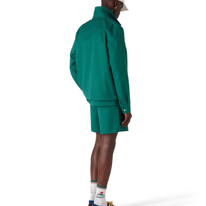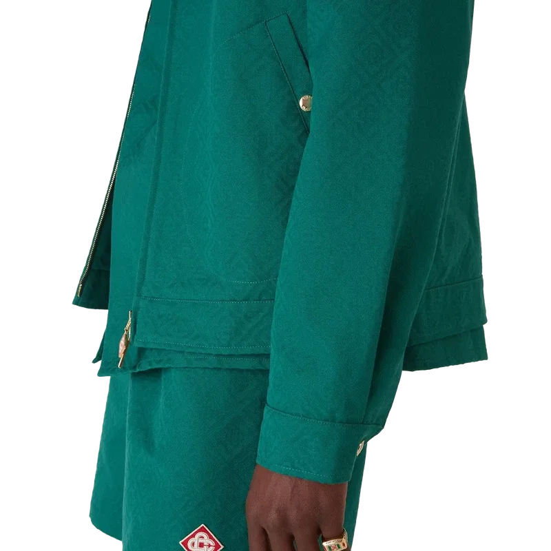 La chaqueta de jacquard de algodón con monograma es un diseño tipo blusón de manga larga confeccionado en tejido de jacquard de algodón. Cuenta con cierre de cremallera, cuello de embudo, herrajes chapados en oro y bolsillos con solapa inclinada.
