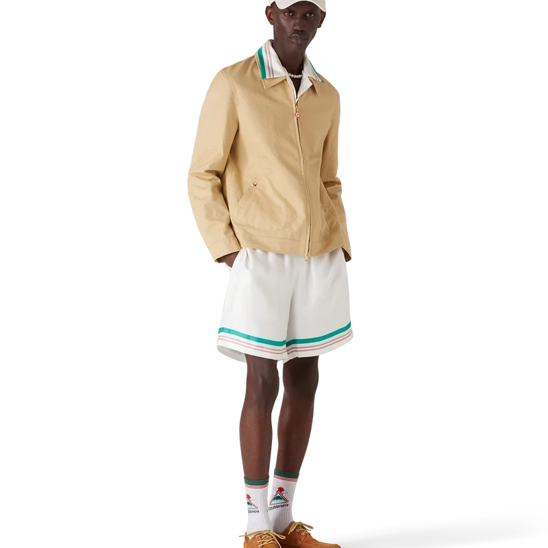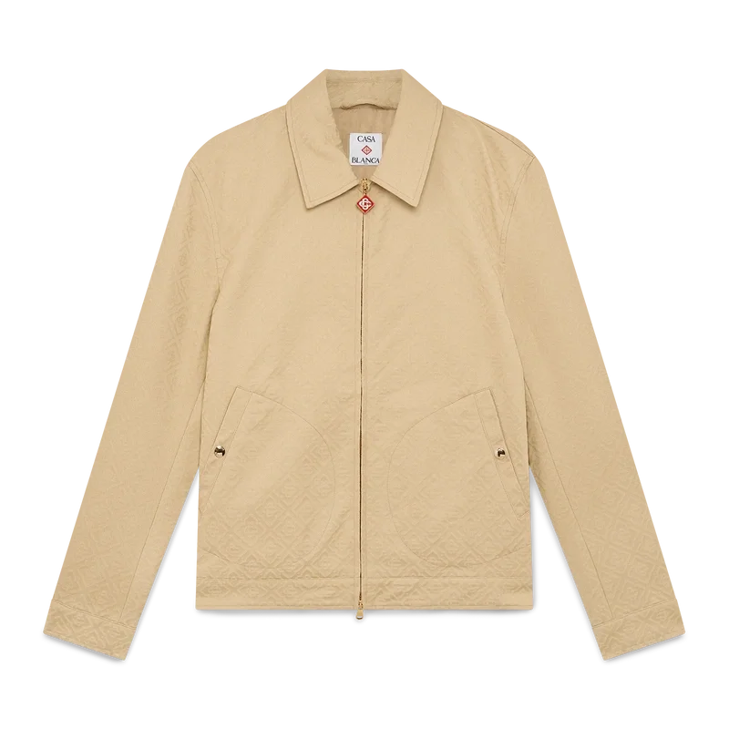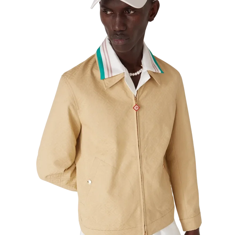 La chaqueta de jacquard de algodón con monograma es un diseño tipo blusón de manga larga confeccionado en tejido de jacquard de algodón. Cuenta con cierre de cremallera, cuello de embudo, herrajes chapados en oro y bolsillos con solapa inclinada.